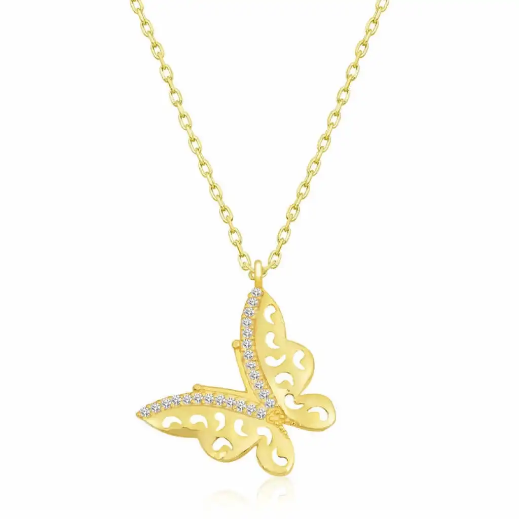 Kelebek; kadınlarca tercih edilen en popüler motiflerden biridir. Sevenlerine doğanın gizemini ve insan hayal gücünün zenginliğini hatırlatır. Özgürlüğü masumiyeti ve saflığı simgeleyen kelebekler, tertemiz sevginin ve aşkın ifadesidir. Sizin olduğu kadar sevdiklerinizin de keyifle takacağı kelebek bayan kolye, sevdiğinize en güzel hediyelerden biri olacaktır. Kolye 925 ayar gümüşten imal edilmiştir. Gümüş üzerine altın kaplama yapılmıştır. Altın kaplama yapılan gümüş bayan kolyeler parlaklığını uzun süre muhafaza eder ve oksitlenmesini geciktirir. Gümüş olan zincir boyu ortalama 45 cm'dir. Tüm gümüş bayan kolyelerde olduğu gibi gümüş gold kelebek bayan kolye modeli de el emeği ile üretilmiştir. Gümüş ve değerli taşlar nedeniyle belirtilen ortalama ürün ağırlığında ± %10 sapma olabilmektedir.