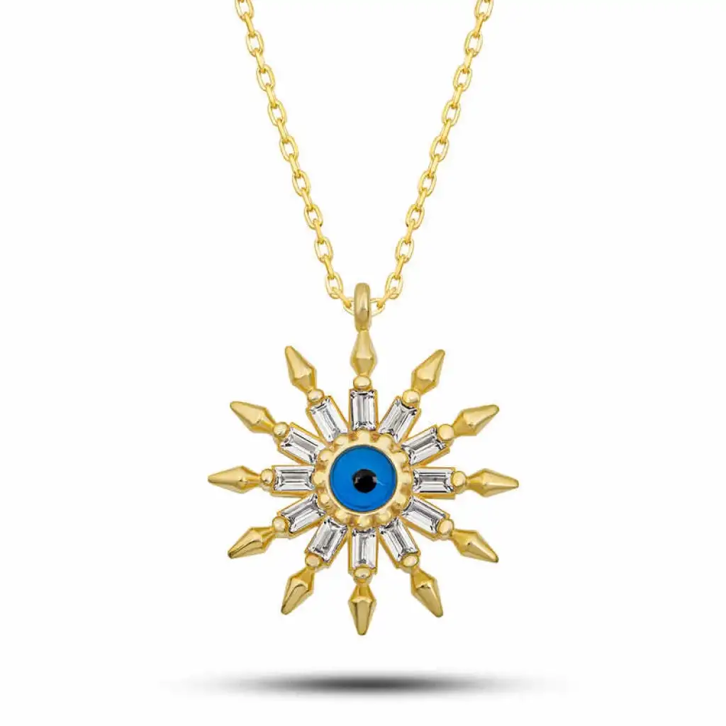 Nazar Boncuğu(koruyucu göz) inancı,kıskanç bir bakışın yol açabileceği kötü enerjilere karşı korunmayı amaçlar.Antik Mezopotamya’dan bu yana birçok kültürde kullanılır.Bu kolye,koruyucu göz ile pozitif enerji yayan güneş sembolünü birleştirerek;hem ruhsal bir savunma mekanizması hem de yaşam kaynağı gücü sunar.Mavi renkli göz simgesi,huzur, pozitif enerji ve ruhsal dinginlik çağrıştırır.Gümüş üzerine gold kaplama yapılmıştır.Gold kaplama yapılan gümüş ürünler parlaklığını uzun süre muhafaza eder,oksitlenmesi gecikir.Tüm gümüş kolyeler de olduğu gibi koruyucu göz güneş kolye de tamamı el emeği ile üretilmiştir.Gümüş ve değerli taşlar nedeniyle belirtilen ortalama ürün ağırlığında ± %10 sapma olabilmektedir.