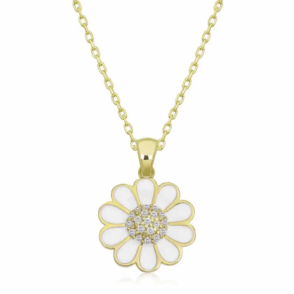 Papatya çiçeği temiz sevgi anlamını ifade eder. En büyük özelliklerinden biri her sapında bir tane olmasıdır. Bu güzellik tasarlanarak ortaya çıkan bu ışıl ışıl kolye zirkon taşlarla süslendi... Bu şık kolye; doğum günü hediyesi, sevgililer günü hediyesi veya annelere hediye olarak özel günlerde tercih edilebilecek mükemmel bir seçenektir. Gümüş papatya kadın kolye 925 ayar gümüşten imal edilmiştir. Bu kolye üzerinde gold kaplama vardır. Gold kaplama yapılan ürünler parlaklığını uzun süre muhafaza eder. Üzerinde bulunan ışıl ışıl taşlar zirkondur. Tüm gümüş kadın kolye modellerinde olduğu gibi gümüş papatya kadın kolye modeli de el emeği ile üretilmiştir. Gümüş ve değerli taşlar nedeniyle belirtilen ortalama ürün ağırlığında ± %10 sapma olabilmektedir.