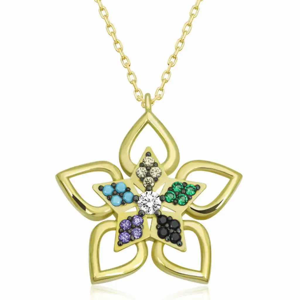 Gümüş Gold Renkli Taşlı Çiçek Kadın Kolye