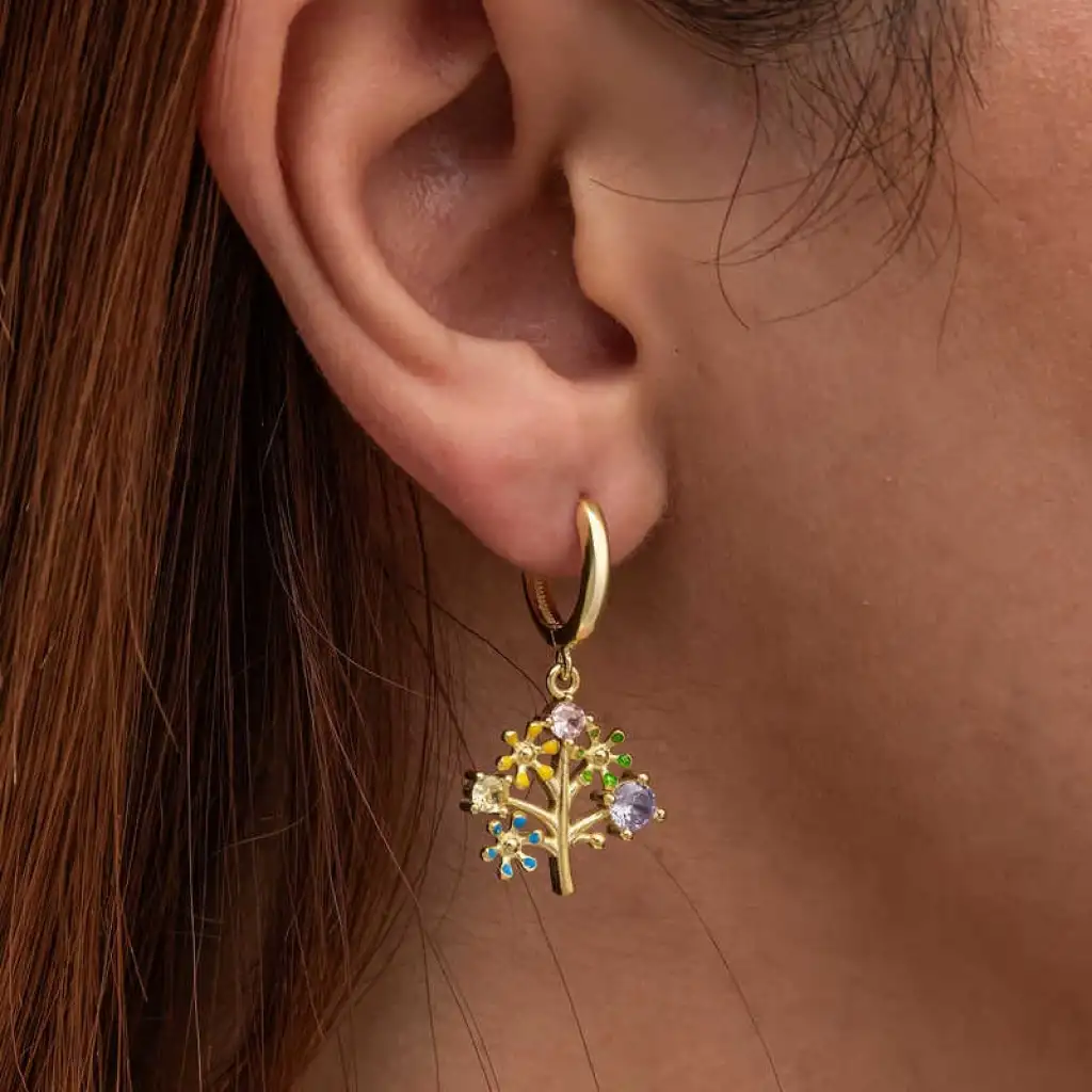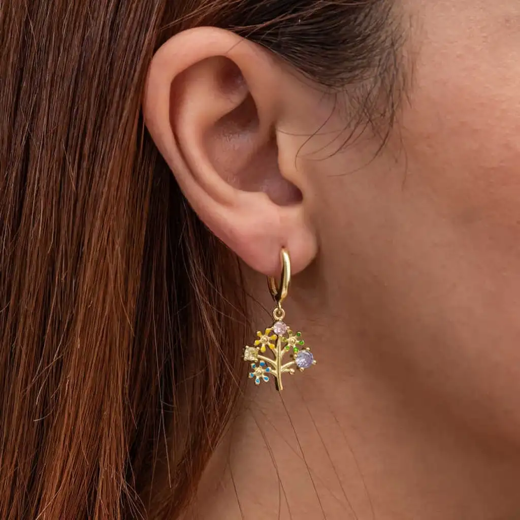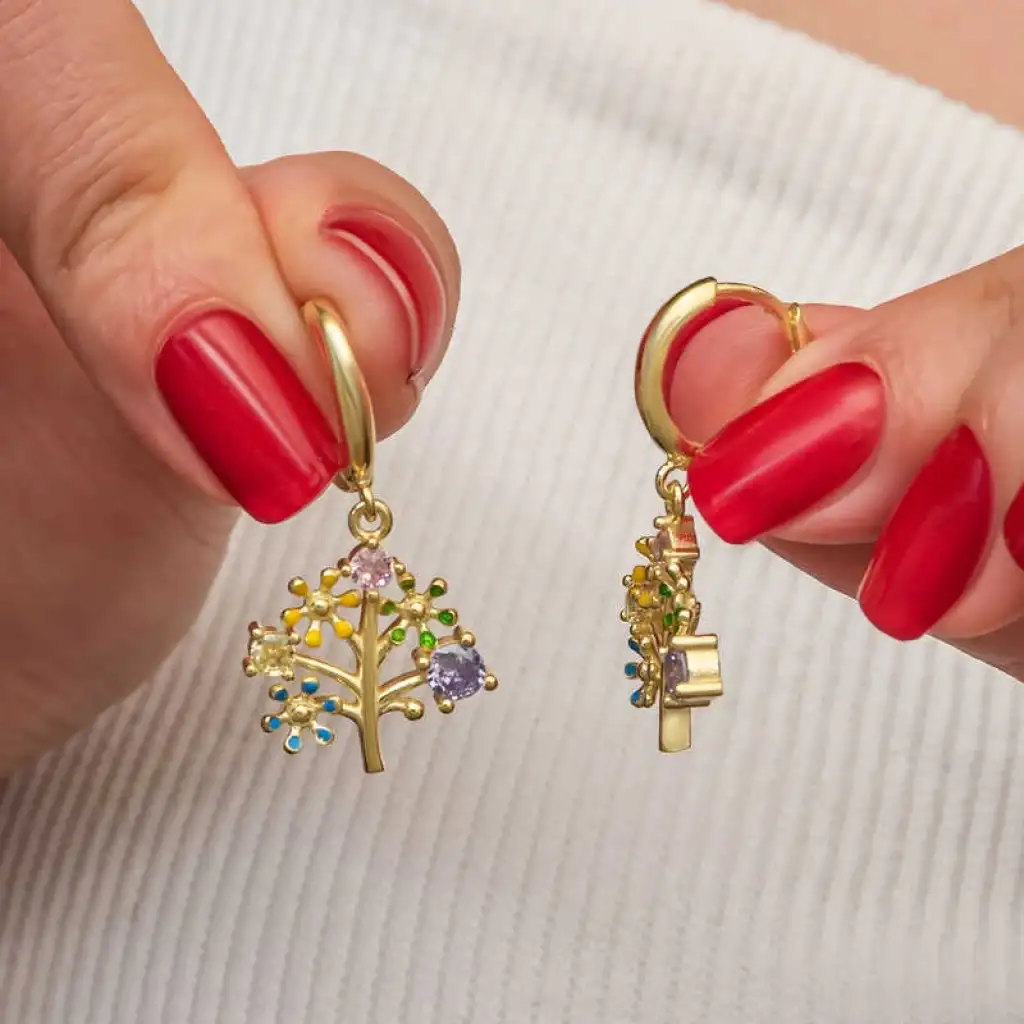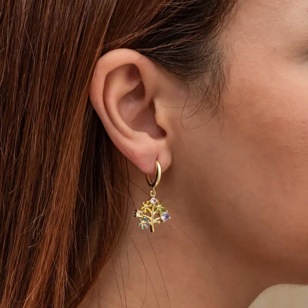 Gümüş Gold Renkli Taşlı Hayat Ağacı Kadın Küpe
