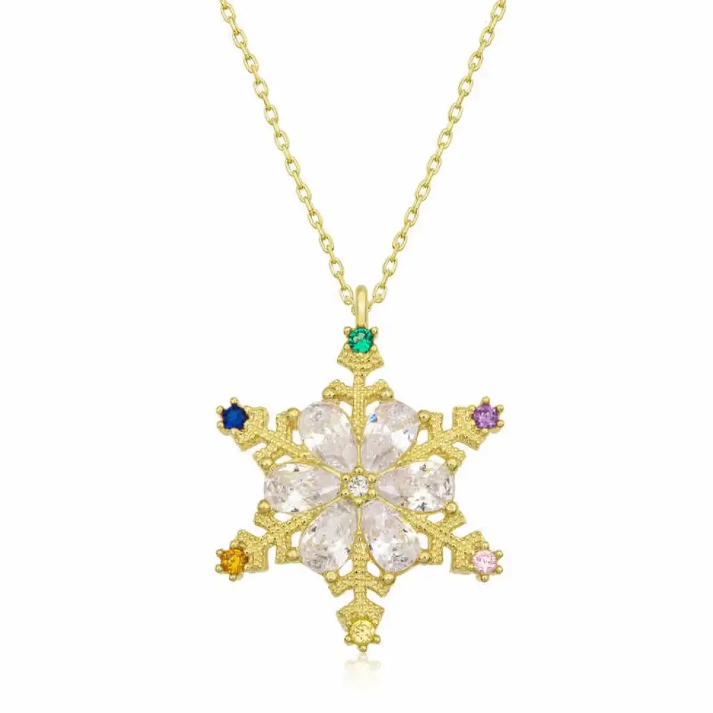 Her kar tanesinden aslında sadece bir tane var. Sevdiğiniz kişiye hediye ettiğiniz kar tanesi kolye ile onun sizin için eşsiz ve biricik olduğunu sessizce dillendirmiş oluyorsunuz. Sizlerde her zevke uygun gümüş kar tanesi kadın kolye modeli ile şıklığınıza ışıltı katın. Kar tanesi kadın kolye 925 ayar gümüşten imal edilmiştir. Gümüş üzerine gold kaplama yapılmıştır. Gold kaplama yapılan gümüş kadın kolye modelleri parlaklığını uzun süre muhafaza eder ve oksitlenmesi gecikir. Kolye üzerinde bulunan beyaz ve renkli taşlar zirkondur. Gümüş olan zincir boyu ortalama 45 cm'dir. Gümüş kar tanesi kadın kolye modeli diğer kar tanesi kadın kolye modelleri gibi el emeği ile üretilmiştir. Gümüş ve değerli taşlar belirtilen nedeniyle ürün ağırlığında ± %10 sapma olabilmektedir.