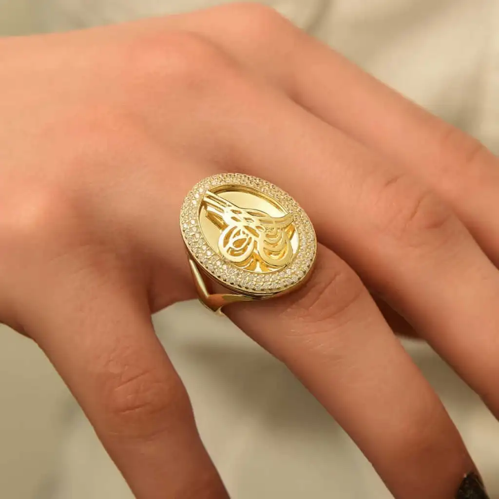 Osmanlı Devleti ve İmparatorluğu'ndaki padişahların imza olarak da kullandığı tuğra sembolü gümüş ile birleşerek anlamlı bir kolye haline gelmiştir. Böylelikle sevdiklerinizi veya kendinizi dini ve derin bir anlama sahip olan bu gümüş Tuğra armalı bayan yüzük ile sevindirebilirsiniz. Kolye 925 ayar gümüşten imal edilmiştir. Gümüş üzerine altın kaplama yapılmıştır. Altın kaplama yapılan gümüş bayan yüzük modelleri parlaklığını uzun süre muhafaza eder, gümüşe altın rengini verir. Yüzük üzerinde bulunan taşlar zirkondur. Ürünlerimizin tamamı el emeği ile üretilmiştir. Gümüş ve değerli taşlar nedeniyle belirtilen ortalama ürün ağırlığında ± %10 sapma olabilmektedir.