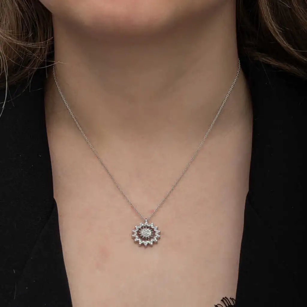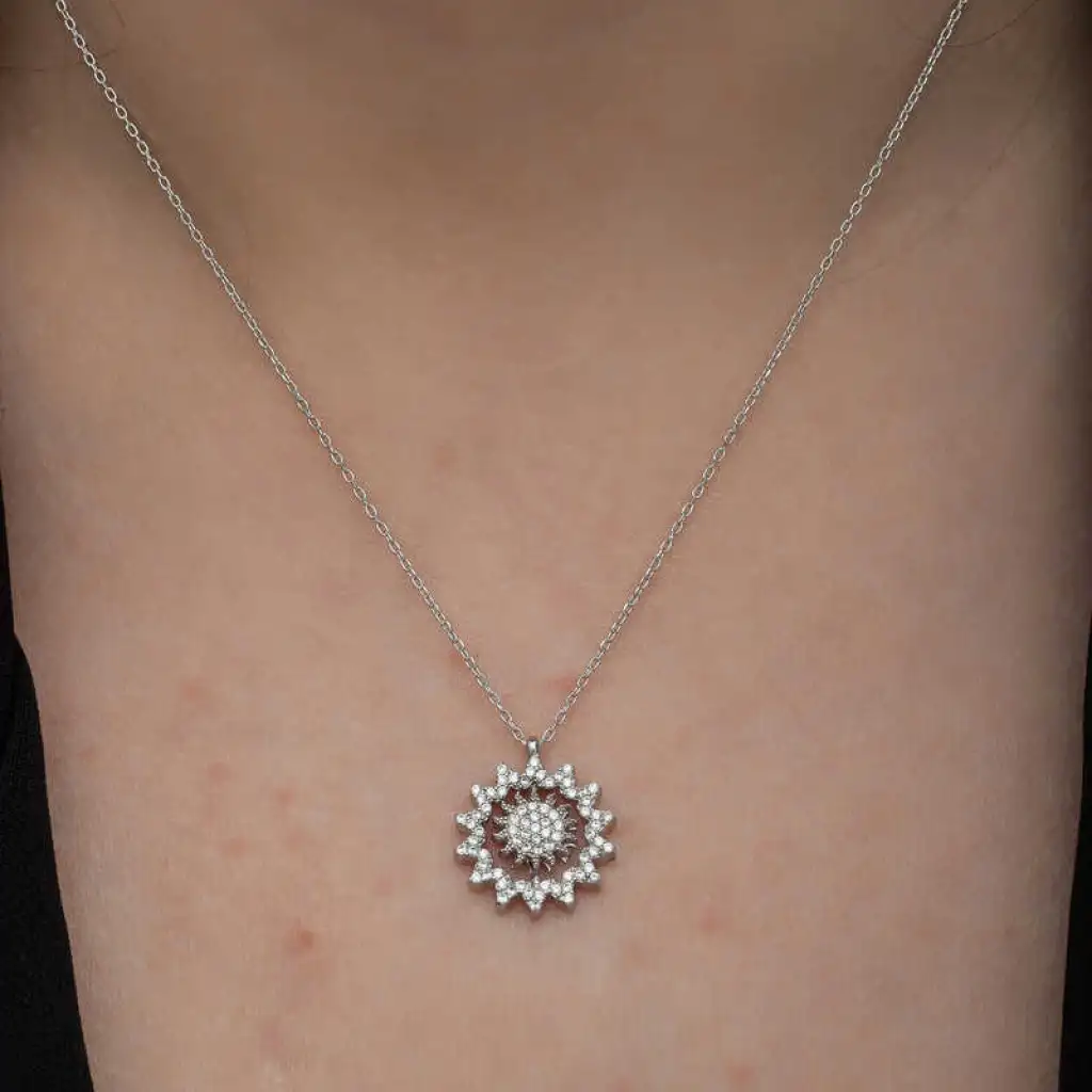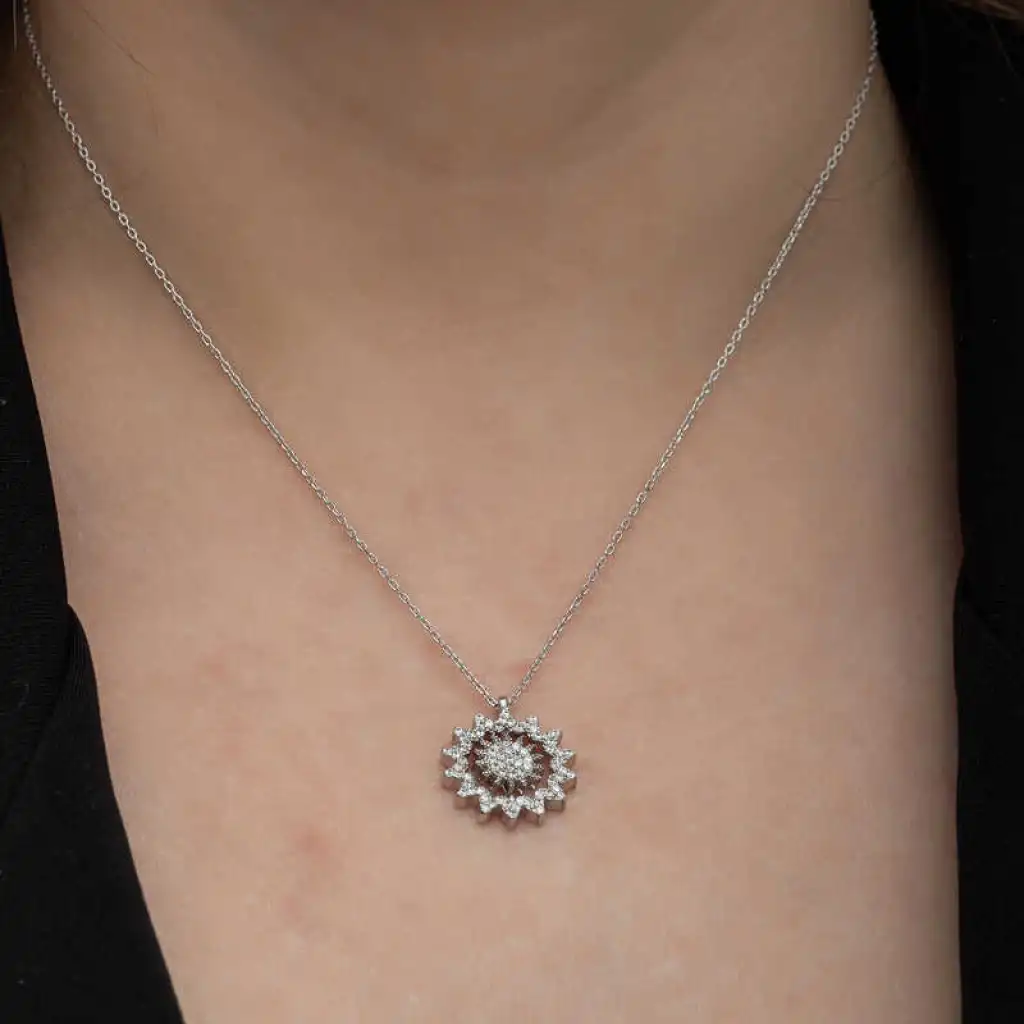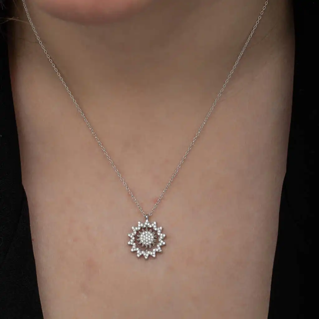 Güneş; ışığın, bilginin, iyiliğin, gücün ve yönetimin sembolüdür. Bu ışıl ışıl ve farklı tasarımıyla göz kamaştıran kolye; 925 ayar gümüşten imal edilmiştir. Gümüş üzerine rodyum kaplama yapılmıştır. Rodyum kaplama yapılan gümüş ürünler parlaklığını uzun süre muhafaza eder, oksitlenmesi gecikir. Gümüş beyaz taşlı güneş kadın kolye üzerinde bulunan taşlar zirkon'dur. Tüm gümüş kolyelerde olduğu gibi gümüş güneş kadın kolye de tamamı el emeği ile üretilmiştir. Gümüş ve değerli taşlar nedeniyle belirtilen ortalama ürün ağırlığında ± %10 sapma olabilmektedir.