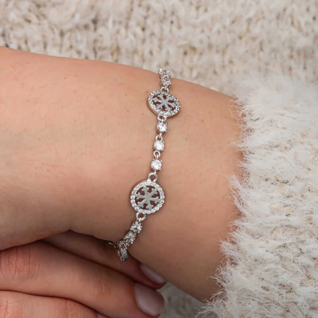 Her kar tanesi birbirinden farklıdır,bu da bireyselliği ve özgünlüğü simgeler.Halka sadelik ve sonsuzluğu simgeler. Hayatın döngüselliği ve ilişkilerin kalıcılığına işaret eder.Bunun yanında insanların tıpkı kar taneleri gibi birbirlerine zarar vermeden de mutlu bir şekilde yaşayabileceklerini sembolize etmektedir. Bu şık bileklik; doğum günü hediyesi, sevgililer günü hediyesi veya annelere hediye olarak özel günlerde tercih edilebilecek mükemmel bir seçenektir. Bileklik, 925 ayar gümüşten imal edilmiştir. Gümüş üzerine rodyum kaplama yapılmıştır. Rodyum kaplama yapılan ürünler parlaklığını uzun süre muhafaza eder ve oksitlenmesi gecikir. Tüm gümüş bilekliklerde olduğu gibi bu gümüş rodyum kar tanesi kadın bileklik de tamamı el emeği ile üretilmiştir. Gümüş ve değerli taşlar nedeniyle belirtilen ortalama ürün ağırlığında ± %10 sapma olabilmektedir.