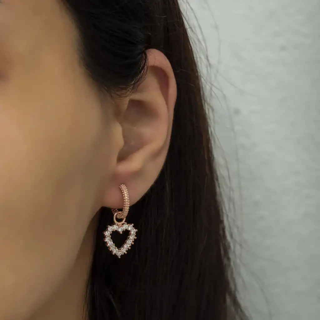 Kalp deseninin hepsi taşlı olan bu harika tasarım kalp küpe modeli 925 ayar gümüşten imal edilmiştir. Kalp tasarımlı küpeler aşkı çağrıştırır. Bu yüzden gümüş küpe güzel bir hediye seçeneği de olabilir. Bu küpe üzerinde zirkon taşlar kullanılmıştır. Gümüşün üzerine oksitlenmesinin gecikmesi ve parlaklığını uzun süre muhafaza etmesi için rose kaplama yapılmıştır. Bu bayan kalp küpe modeli diğer gümüş bayan kalp küpe modellerinde olduğu gibi el emeği ile üretilmiştir. Gümüş ve değerli taşlar nedeniyle belirtilen ortalama ürün ağırlığında ± %10 sapma olabilmektedir.