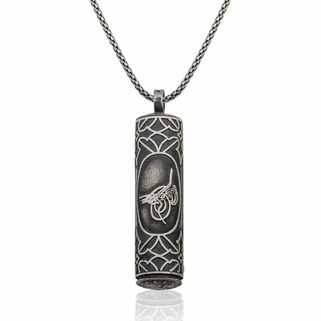 Tuğra, Osmanlı sultanlarının imzası anlamına gelir. Her tuğra; ona ait olan padişahın ismini, varlığını, hükümdarlığını ifade eder. Tuğra sembolü her padişaha göre farklı olmak üzere birçok şekilde günümüze ulaşmıştır. Tuğra Osmanlının her döneminde korunmuş, önemini hiç kaybetmemiştir. Ve zamanla hat sanatımızda da önemli bir yere sahip olup, günümüzde hattatlar tarafından sanatsal olarak yaşatılmaktadır. Bu sanatı yansıtan gümüş kolyeyi severek kullanabilirsiniz. İçine sürekli yanınızda taşımak istediğiniz dua vs. ne isterseniz yerleştirebilirsiniz. İçi açılabilen tuğralı silindir muskalık modeli 925 ayar gümüşten imal edilmiştir. Gümüş üzerine oksit kaplama yapılmıştır. Oksit kaplama yapılan gümüş kolye modelleri ilk günkü görünümünü uzun süre korur. Tüm gümüş kolyelerde olduğu gibi gümüş tuğra desenli silindir muskalık kolye modelinin de tamamı el emeği ile üretilmiştir. Gümüş ve değerli taşlar nedeniyle belirtilen ortalama ürün ağırlığında ± %10 sapma olabilmektedir.