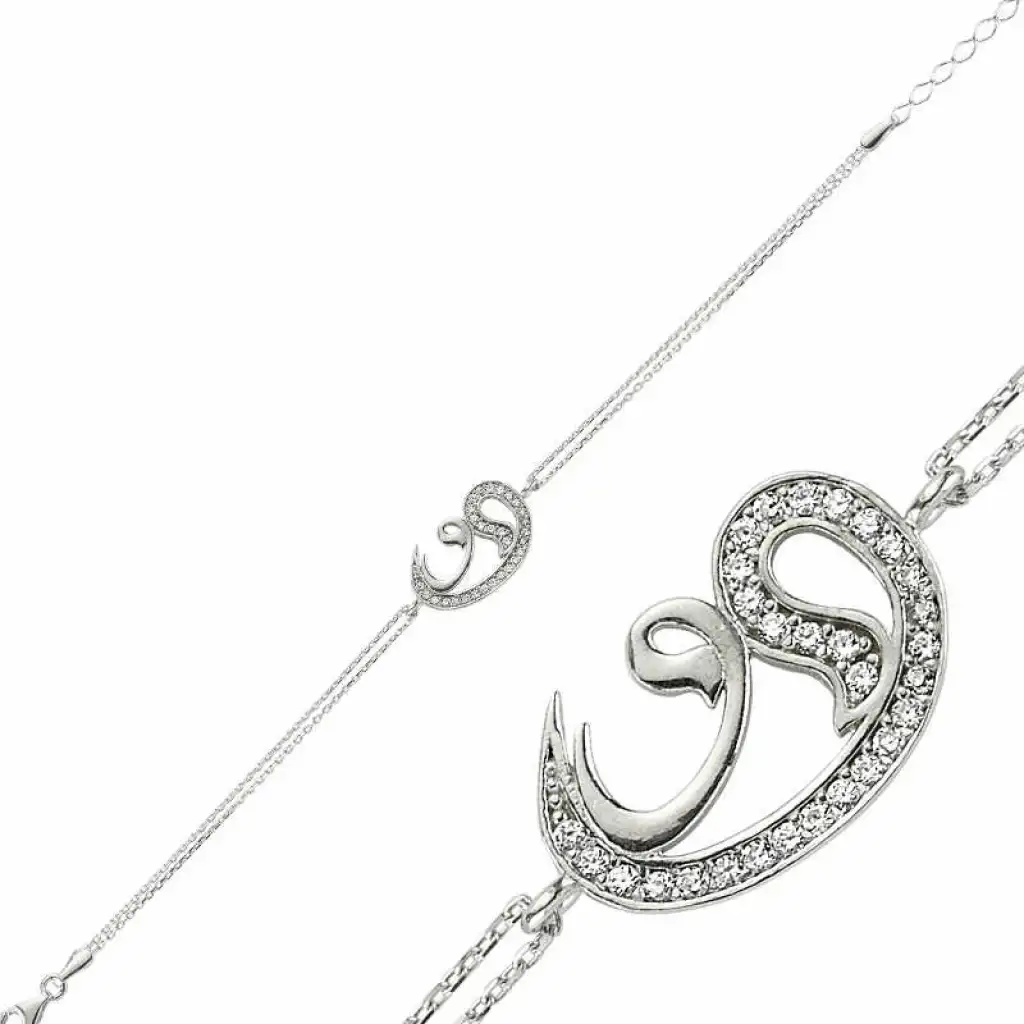 Arapça vav harfinin bulunduğu bu harika tasarım bileklik 925 ayar gümüşten imal edilmiştir. Vav tasavvufta mütevaziliği temsil eder. Şıklığına özen gösteren bayanlar için eşsiz bir bilekliktir. Gümüş üzerine rodyum kaplama yapılmıştır. Rodyum kaplama yapılan gümüş bayan bileklik modelleri parlaklığını uzun süre muhafaza eder, oksitlenmesi gecikir. İki vav desenli bu bileklik üzerinde bulunan taşlar zirkondur. Zirkon taşlı iki vav gümüş bileklik modeli el emeği ile üretilmiştir. Gümüş ve değerli taşlar nedeniyle belirtilen ortalama ürün ağırlığında ± %10 sapma olabilmektedir.