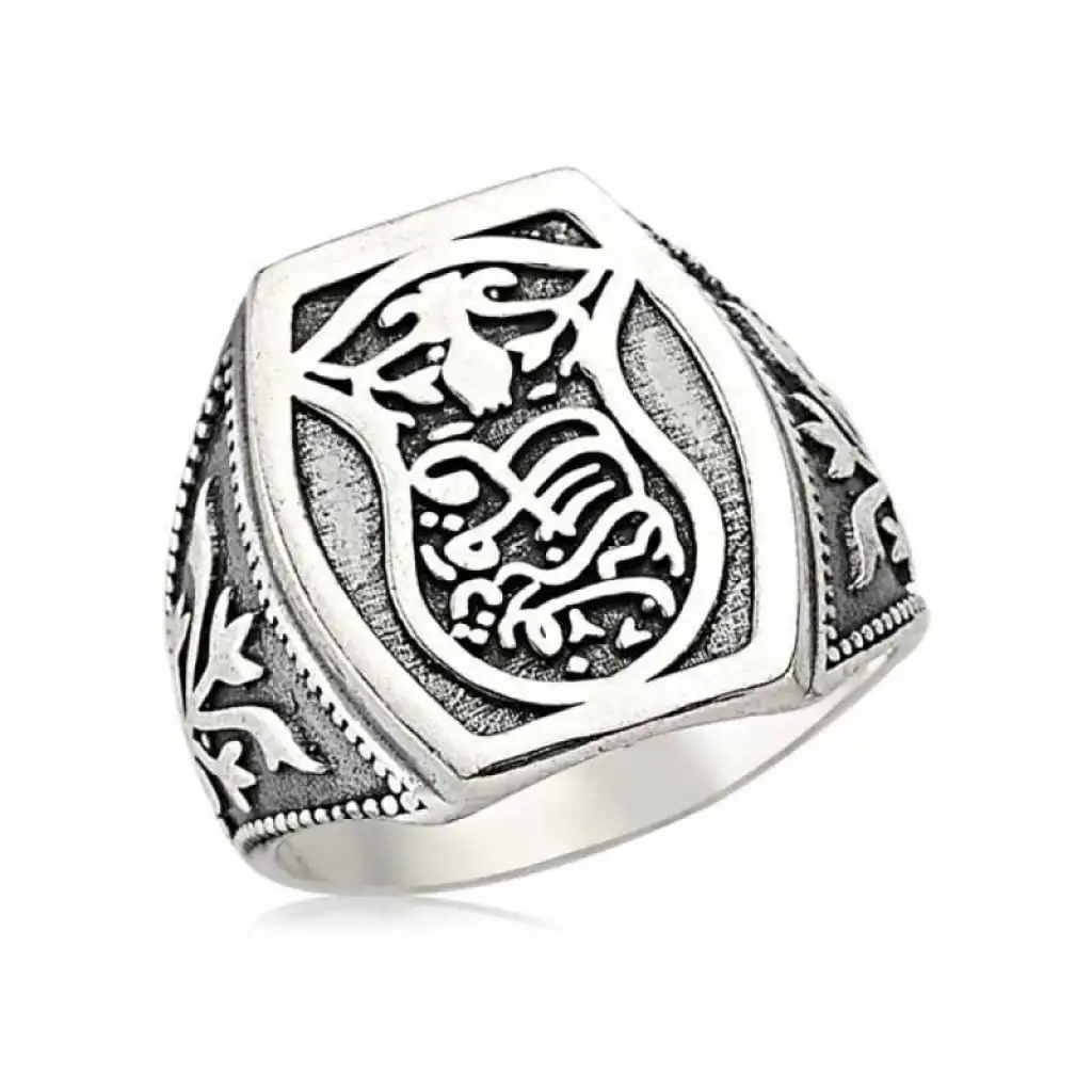 Kadem-i Şerif Peygamber Efendimizin ayağına giydiği nalın şeklinde ki sandelettir. Kademi Şerif düz topuksuz parmak arası bir terlik yada sandalet tarzında bir ayakkabıdır. İslamiyette Kadem-i Şerif’in önemi çok büyüktür.Ve çok büyük şifaları vardır... Bu maneviyattan esinlenerek oluşturulan Kadem-i Şerif erkek yüzük; kendinize yada sevdiklerinize doğum gününde, babalar gününde yada özel günlerde hediye edebilirsiniz. Bu şık erkek yüzük 925 ayar gümüşten imal edilmiştir. Gümüş üzerine oksit kaplama yapılmıştır. Oksit kaplama yapılan yüzükler parlaklığını uzun süre muhafaza eder. Tüm erkek yüzüklerde olduğu gibi gümüş Kadem-i Şerif erkek yüzük de el emeği ile üretilmiştir. Gümüş ve değerli taşlar nedeniyle ürün ağırlığında ± %10 sapma olabilmektedir.