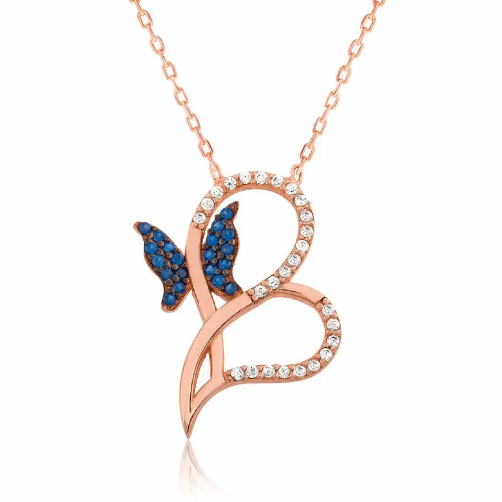 Özgürlüğü masumiyeti ve saflığı simgeleyen kelebekler, tertemiz sevginin ve aşkın ifadesidir. Bahar kelebekleri anlam itibari ile aşkın küçük bir kıvılcım ile başladığı daha sonra büyük bir sabır ile büyüdüğü ve en sonunda ilan-ı aşkı ifade eder. Baharı yansıtan bu şık yüzük sizin olduğu kadar sevdiklerinizin de keyifle takacağı gümüş kelebek kolye modeli en güzel hediyelerden biri olacaktır. Gümüş üzerine rose altın kaplama yapılmıştır. Rose altın kaplama yapılan gümüş bayan kolyeler parlaklığını uzun süre muhafaza eder ve oksitlenmeyi geciktirir. Üzerinde bulunan taşlar zirkondur. Tüm gümüş bayan kolyelerde olduğu gibi gümüş kalbimin kelebeği bayan kolye modeli de el emeği ile üretilmiştir. Gümüş ve değerli taşlar nedeniyle belirtilen ortalama ürün ağırlığında ± %10 sapma olabilmektedir.