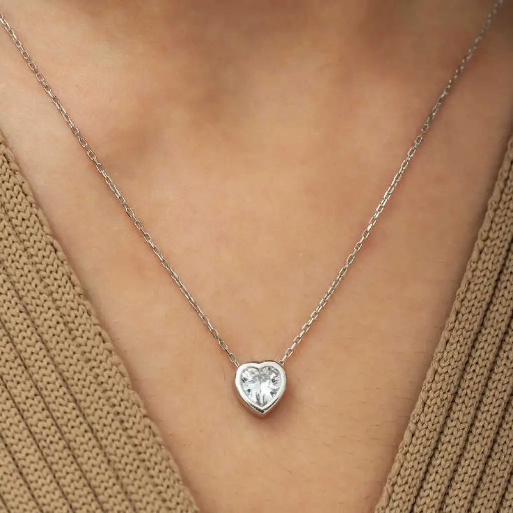 Kalp simgesi daima koşulsuz sevginin ve aşkın sembolü olmuştur. Dini öğretilerde ise kalbin gücü sınırsızdır. Çünkü kalp Yaratanın evi, bizim ise evrene açılan gerçeklik kapımızdır. Bu şık gümüş kalp kolye; doğum günü hediyesi, sevgililer günü hediyesi veya annelere hediye olarak özel günlerde tercih edilebilecek mükemmel bir seçenektir. Gümüş kalp bayan kolye 925 ayar gümüşten imal edilmiştir. Bu kolye üzerinde rodyum kaplama yapılmıştır. Rodyum kaplama yapılan gümüş bayan kolye modelleri parlaklığını uzun süre muhafaza eder. Üzerinde bulunan taş zirkondur. Tüm gümüş bayan kolye modellerimizde olduğu gibi gümüş kalp bayan kolye modeli de el emeği ile üretilmiştir. Gümüş ve değerli taşlar nedeniyle belirtilen ortalama ürün ağırlığında ± %10 sapma olabilmektedir.