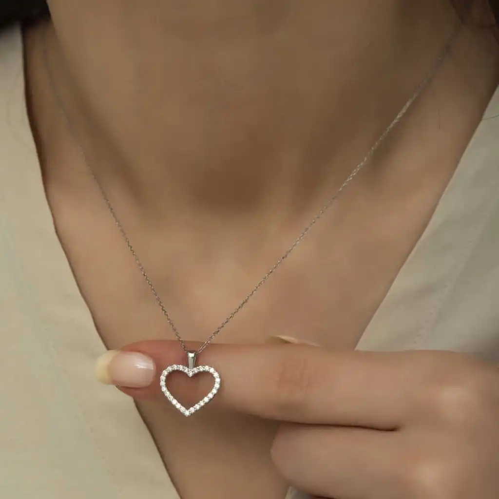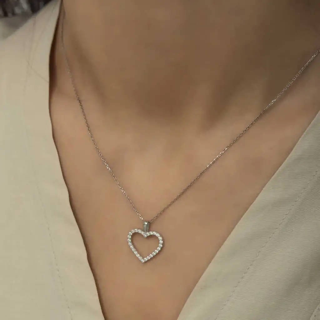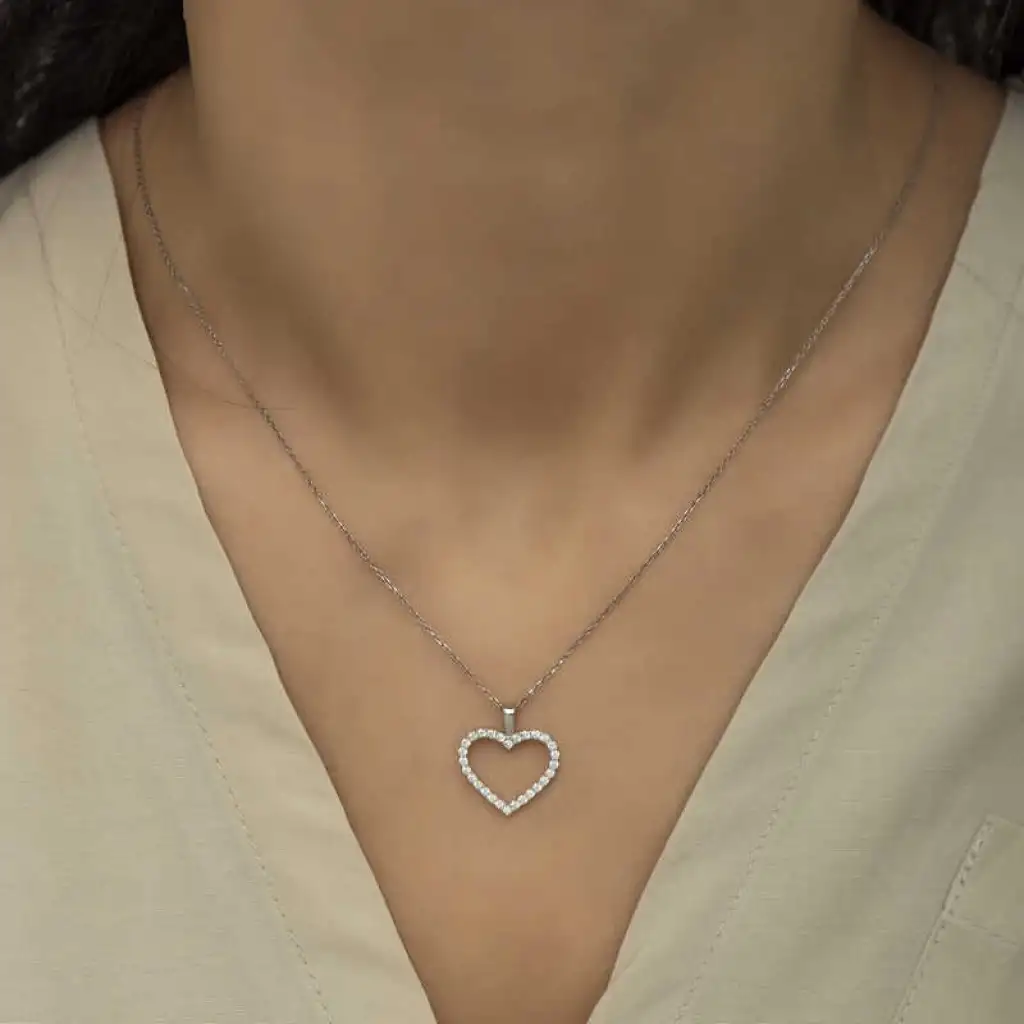 Kalp deseninin hepsi taşlı olan bu harika tasarım kalp kolye modeli 925 ayar gümüşten imal edilmiştir. Kalp tasarımlı kolyeler aşkı çağrıştırır. Bu yüzden gümüş kalp kolye güzel bir hediye seçeneği de olabilir. Bu kolye üzerinde zirkon taşlar kullanılmıştır. Gümüşün üzerine oksitlenmesinin gecikmesi ve parlaklığını uzun süre muhafaza etmesi için rodyum kaplama yapılmıştır. Tamamen gümüş olan zincir uzunluğu ortalama 45 cm’dir. Bu bayan kalp kolye modeli diğer gümüş bayan kalp kolye modellerinde olduğu gibi el emeği ile üretilmiştir. Gümüş ve değerli taşlar nedeniyle belirtilen ortalama ürün ağırlığında ± %10 sapma olabilmektedir.