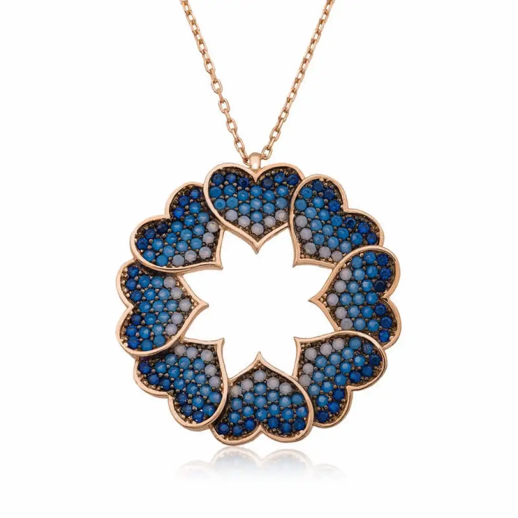 Aşkın ve sevginin simgesi kalpli bayan kolye ile sevdiğiniz kişiye hem anlamlı hem de güzel bir hediye verebilirsiniz. Dünyanın dört bir yanında herkesin birbirine sevgi sözcükleri söylediği sevgililer gününde siz de sevgilinize aşkınızı ilan eden bu kalp çemberi kolyeyi hediye edebilirsiniz. Gümüş kalp çemberi bayan kolye 925 ayar gümüşten imal edilmiştir. Gümüş üzerine rose altın kaplama yapılmıştır. Rose altın kaplama yapılan gümüş bayan kolye modelleri parlaklığını uzun süre muhafaza eder, gümüşe pembe rengi verir ve oksitlenmesi gecikir. Kolye üzerinde bulunan taşlar zirkondur. Gümüş olan zincir boyu ortalama 45 cm'dir. Tüm gümüş bayan kolye modellerinde olduğu gibi gümüş kalp çemberi kolye modeli de el emeği ile üretilmiştir. Gümüş ve değerli taşlar nedeniyle belirtilen ürün ağırlığında ± %10 sapma olabilmektedir.