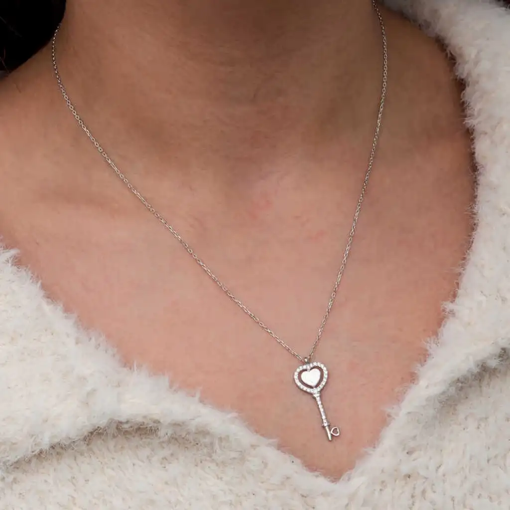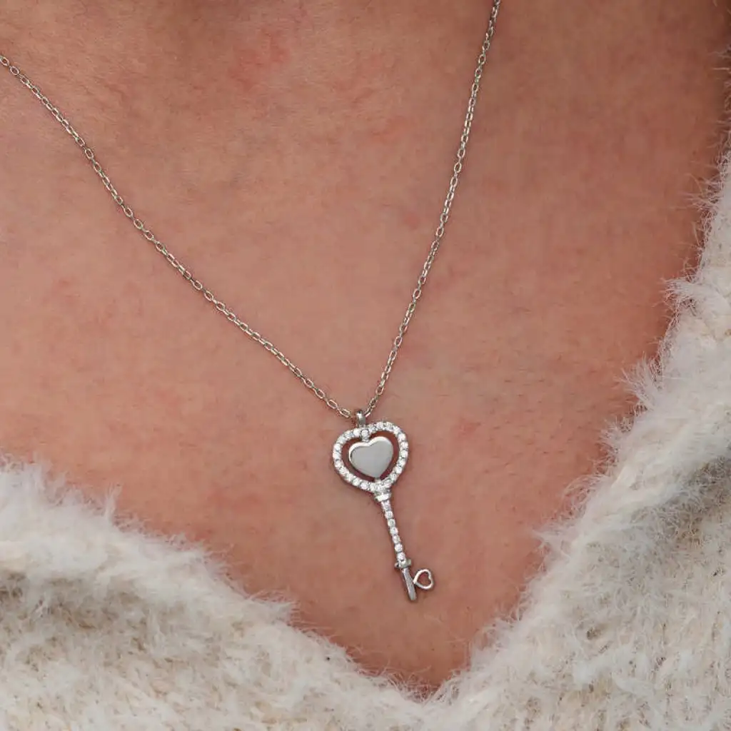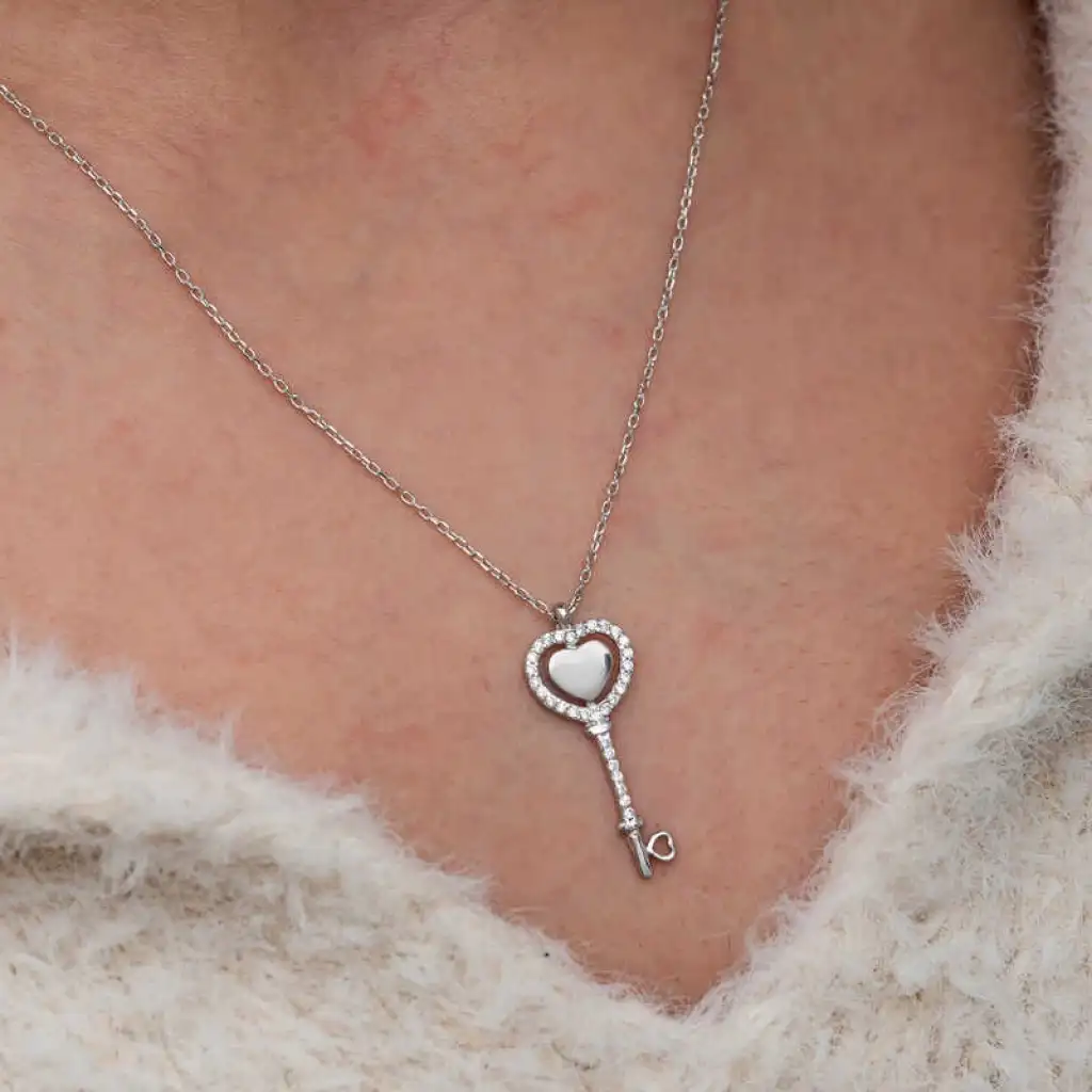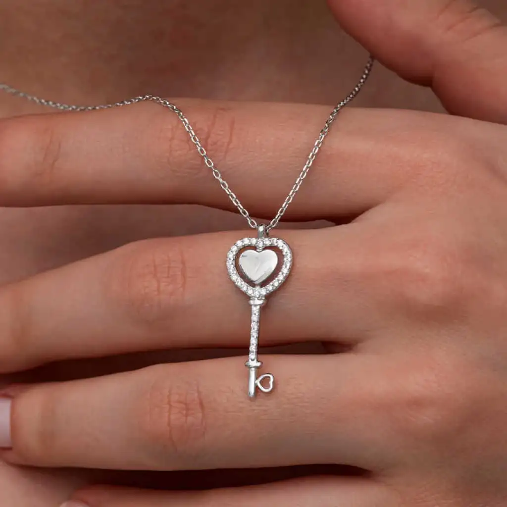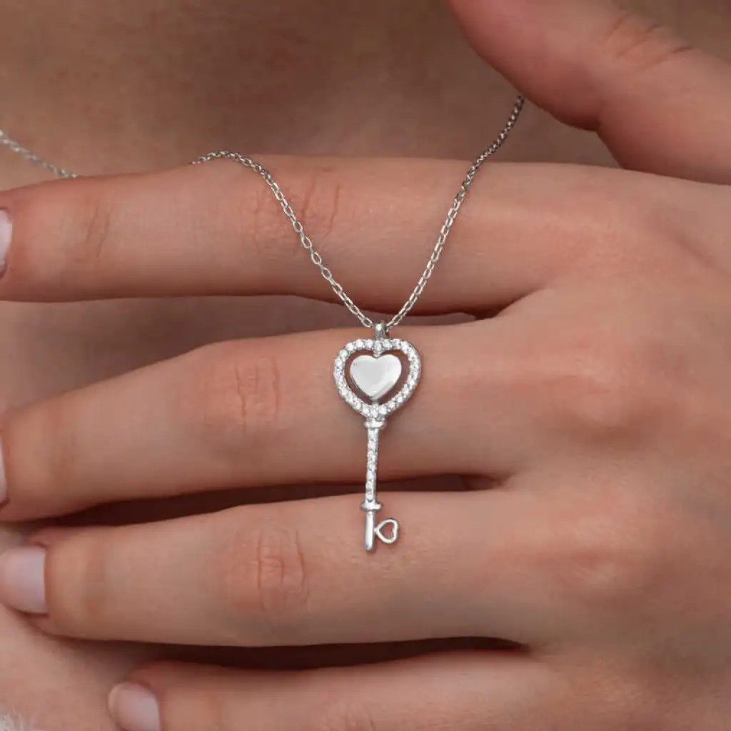 Kalpli Anahtar Kadın Kolye genellikle sevgi, bağlılık ve özel bir ilişkinin sembolü olarak kabul edilir. Kalp, aşkı ve duygusal bağı temsil ederken, anahtar ise güven, sırlar ve mutluluğun kapılarını açmayı simgeler.Bu şık kolye; doğum günü hediyesi, sevgililer günü veya özel günlerde tercih edilebilecek mükemmel bir seçenektir. Kolye; 925 ayar gümüşten imal edilmiştir. Gümüş üzerine rodyum kaplama yapılmıştır. Gümüş ve değerli taşlar nedeniyle belirtilen ortalama ürün ağırlığında ± %10 sapma olabilmektedir.