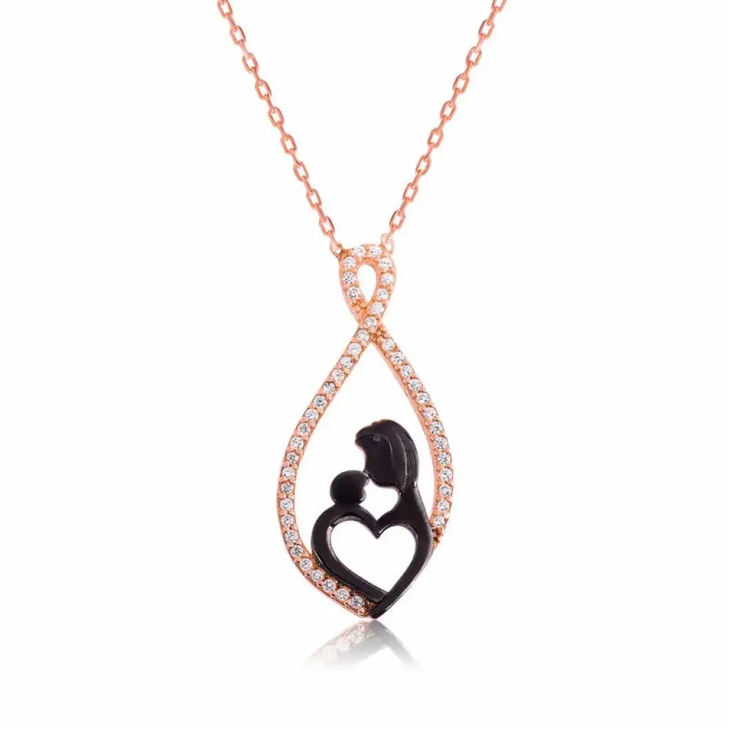 Çocuk ve anne arasındaki sevgiyi temsil eden özel bir tasarımdır. Annenize olan bağlılığınızı belirtmek için alabileceğiniz en uygun hediyelerden biri bu anne çocuk sevgisi kolye olacaktır. Anneniz için tasarlanan bu özel tasarım kalpli anne çocuk kolyesi 925 ayar gümüşten imal edilmiştir. Gümüş üzerine rose kaplama yapılmıştır. Rose kaplama yapılan gümüş anne çocuk kolye modelleri parlaklığını uzun süre muhafaza eder ve oksitlenmesi gecikir. Kolye üzerinde bulunan taşlar zirkondur. Gümüş olan zincir boyu ortalama 45 cm'dir. Gümüş kalpli anne çocuk kolyesi el emeği ile üretilmiştir. Gümüş ve değerli taşlar nedeniyle belirtilen ürün ağırlığında ± %10 sapma olabilmektedir.