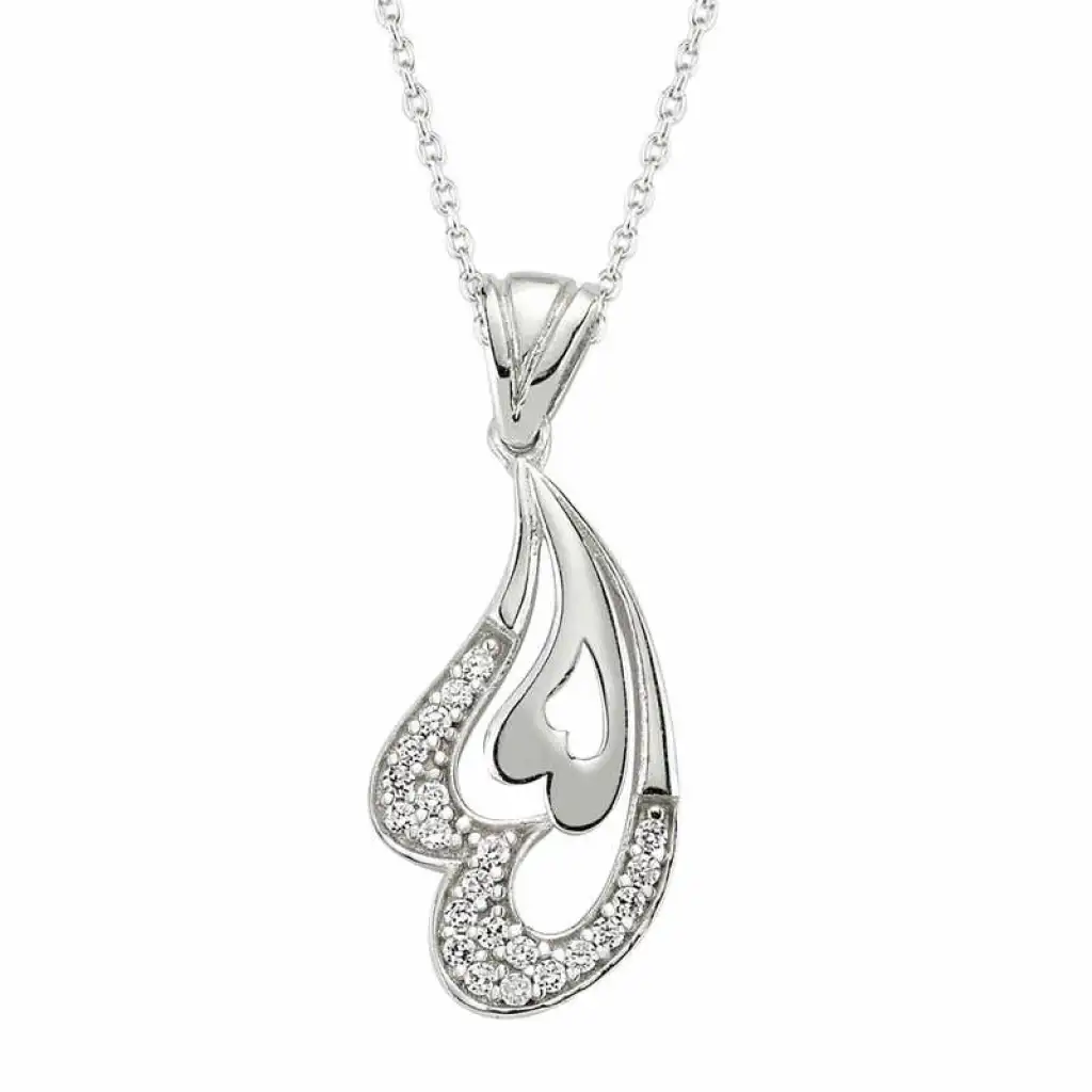 İç içe iki kalpten oluşan bu şık kalpli bayan kolye modeli 925 ayar gümüşten imal edilmiştir. Gümüş üzerine rodyum kaplama yapılmıştır. Rodyum kaplama yapılan gümüş bayan kalpli kolye modelleri parlaklığını uzun süre muhafaza eder ve oksitlenmesi gecikir. Kolye ile birlikte gelecek gümüş olan zincir uzunluğu 45 cm’dir. Tüm bayan kolye modellerinde olduğu gibi gümüş kalpli bayan kolye modeli de el emeği ile üretilmiştir. Gümüş ve değerli taşlar nedeniyle belirtilen ortalama ürün ağırlığında ± %10 sapma olabilmektedir.