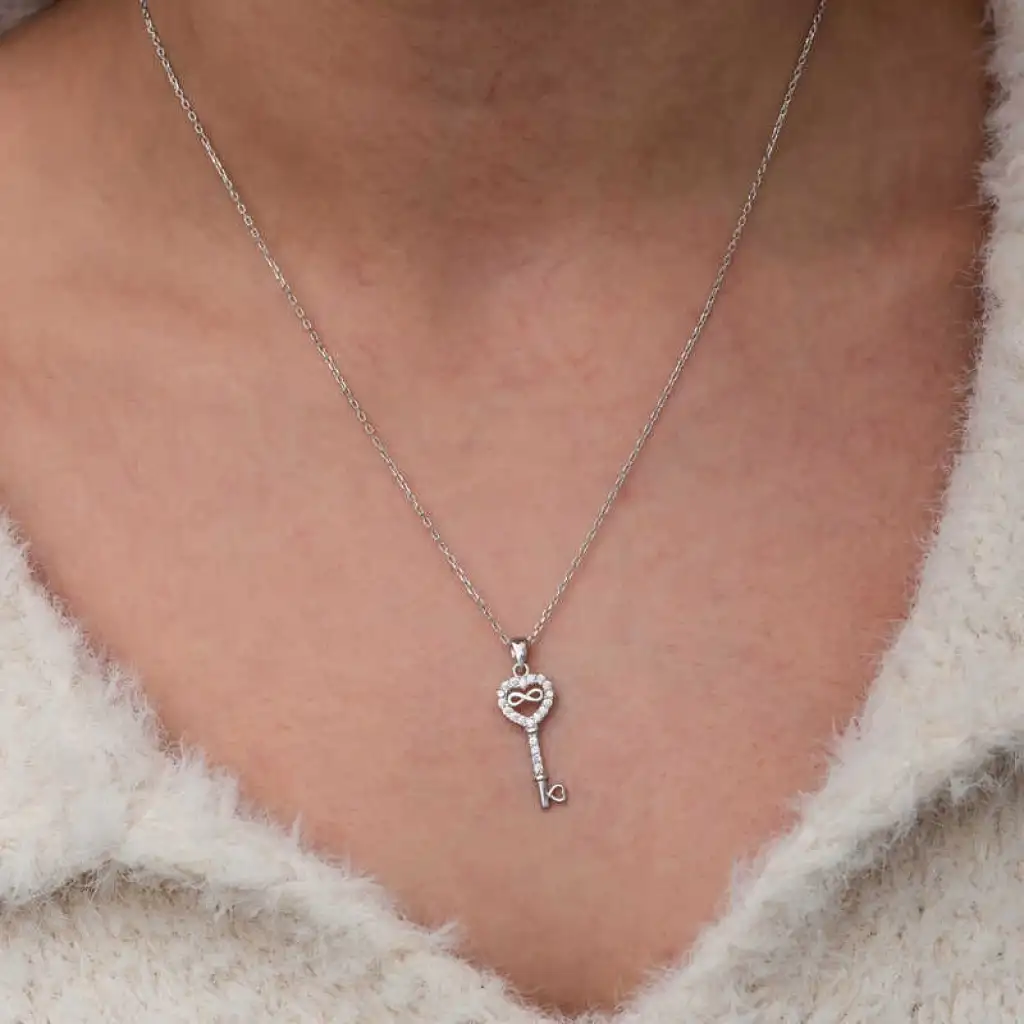 Gümüş Kalpli Sonsuzluk Anahtar Kadın Kolye