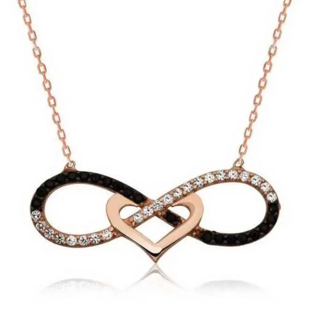 Sevgilinize sonsuz aşkı ifade etmenin en güzel, en anlamlı yollarından biri de ona sonsuzluk temalı gümüş takılar hediye etmektir. Sevgilinize hediye edeceğiniz bu özel kolye ile ona olan sonsuz aşkınızı sevginizi ifade edebilir sonsuza kadar birlikte olacağınız mesajı verebilirsiniz. Sonsuzluk bayan kolye modeli 925 ayar gümüşten imal edilmiştir. Gümüş üzerine rose kaplama yapılmıştır. Rose kaplama yapılan gümüş bayan kolye modelleri parlaklığını uzun süre muhafaza eder , gümüşü pembe rengine çevirir ve oksitlenmesi gecikir. Kolye üzerinde bulunan siyah taşlar zirkondur. Gümüş olan zincirin boyu ortalama 45 cm'dir. Tüm gümüş bayan kolye modellerinde olduğu gibi gümüş kalpli sonsuzluk bayan kolye modeli de el emeği ile üretilmiştir. Gümüş ve değerli taşlar nedeniyle belirtilen ortalama ürün ağırlığında ± %10 sapma olabilmektedir.