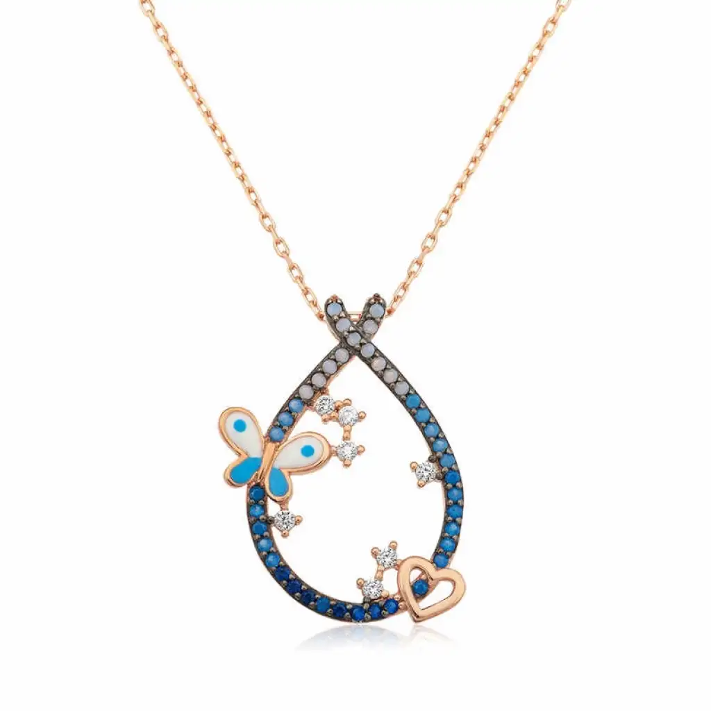 Gümüş Kalpli Ve Kelebekli Damla Kolye