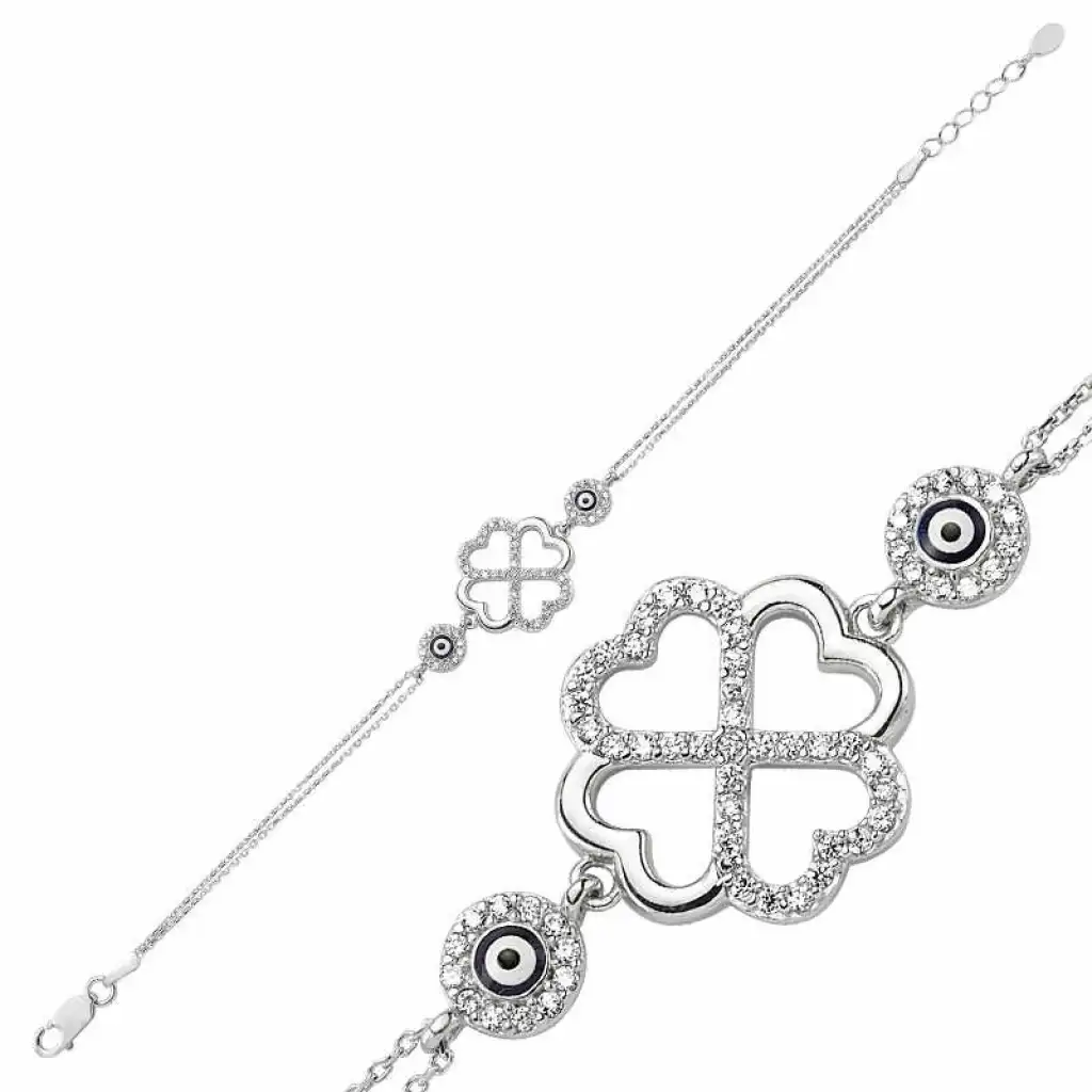 Dört yapraklı yonca bütün kültürlerde iyi şansın sembolü olarak kabul edilir. Yoncanın dört yaprağının da ayrı birer anlamı vardır. Birinci yaprak ümidi, ikincisi imanı, üçüncüsü aşkı, dördüncü yaprak ise şansı simgeler. Kalpli yoncadan oluşan özel tasarım bayan bileklik modeli 925 ayar gümüşten imal edilmiştir. Bu zarif bileklik genç aşıkların özel günlerde tercih edebileceği çok şık bir seçenek olacaktır. Gümüş kalpli yonca bayan bileklik üzerinde rodyum kaplama vardır. Rodyum kaplama yapılan gümüş bayan bileklikler parlaklığını uzun süre muhafaza eder. Gümüş kalpli yonca bayan bileklik sizin olduğu kadar sevdiklerinizin de keyifle takacağı en güzel hediyelerden biri olacaktır. Tüm gümüş bayan bileklik modellerimizde olduğu gibi gümüş kalpli yonca bayan bileklik de el emeği ile üretilmiştir. Gümüş ve değerli taşlar nedeniyle belirtilen ürün ağırlığında ± %10 sapma olabilmektedir.