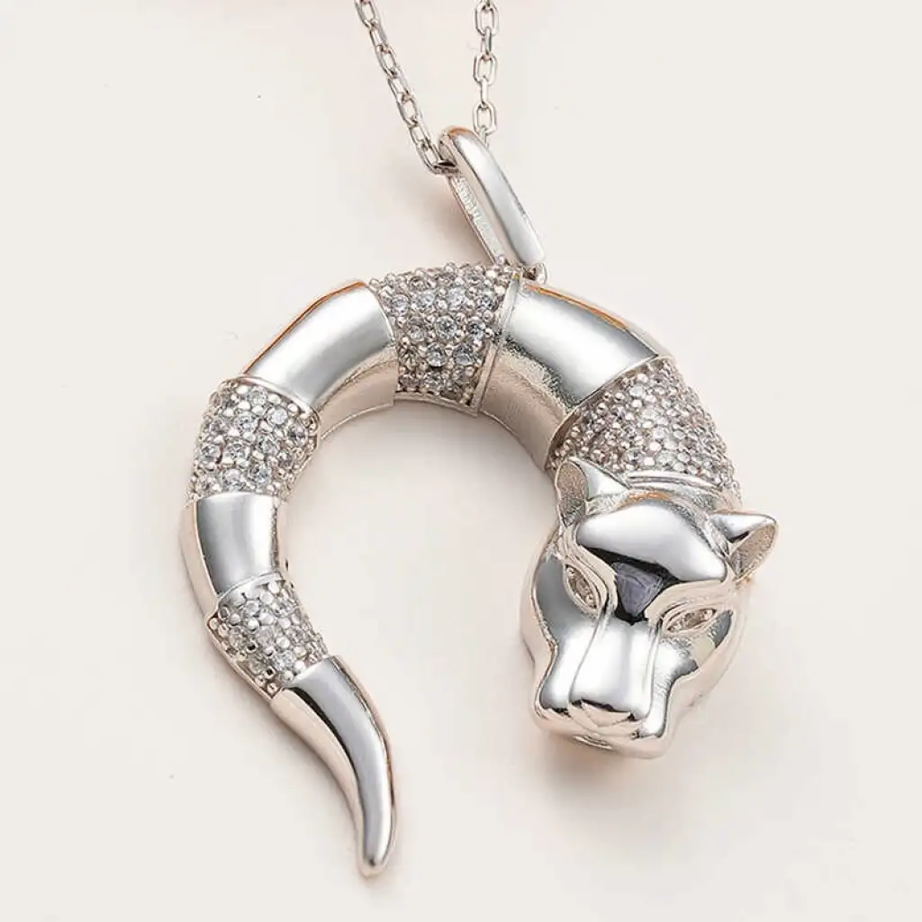 Kaplan büyük gücün ve iktidarın simgesidir Bu güçten esinlenerek tasarlanan kolye ile sevdiklerinizi mutlu etmeye ne dersiniz? Bu şık kolye; 925 ayar gümüşten imal edilmiştir. Gümüş üzerine rodyum kaplama yapılmıştır. Rodyum kaplama yapılan kolyeler parlaklığını uzun süre muhafaza eder. Tüm kadın kolyelerinde olduğu gibi gümüş kaplan figürlü kadın kolye de el emeği ile üretilmiştir. Bu şık kolyeyi; kendinize yada sevdiklerinize doğum gününde, ya da özel günlerde hediye edebilirsiniz. Gümüş ve değerli taşlar nedeniyle ürün ağırlığında ± %10 sapma olabilmektedir.