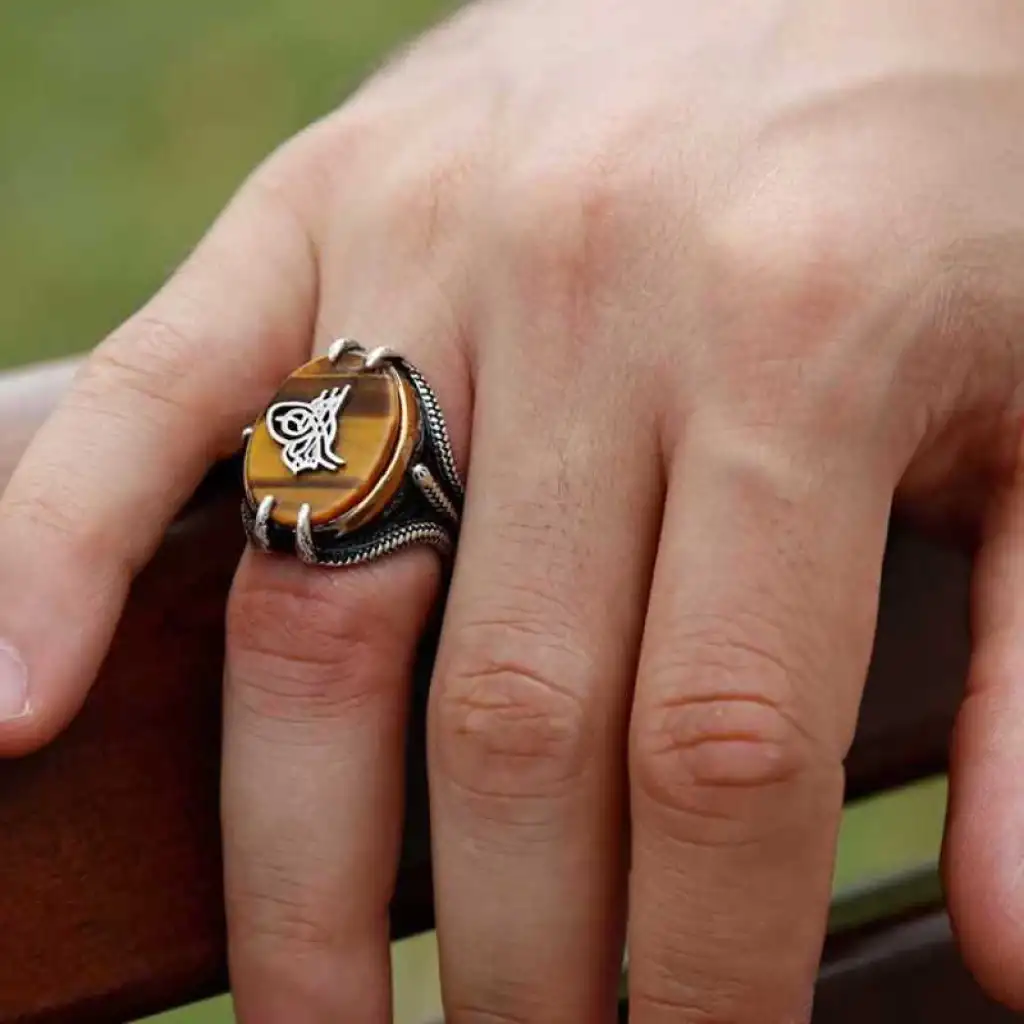 Gümüş Kaplan Gözü Taşlı Tuğralı Erkek Yüzük