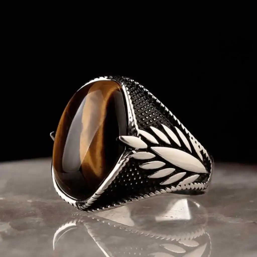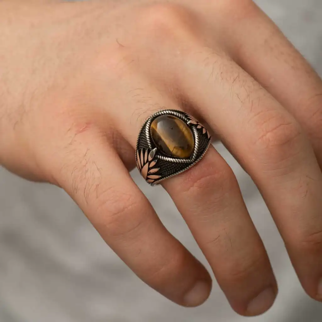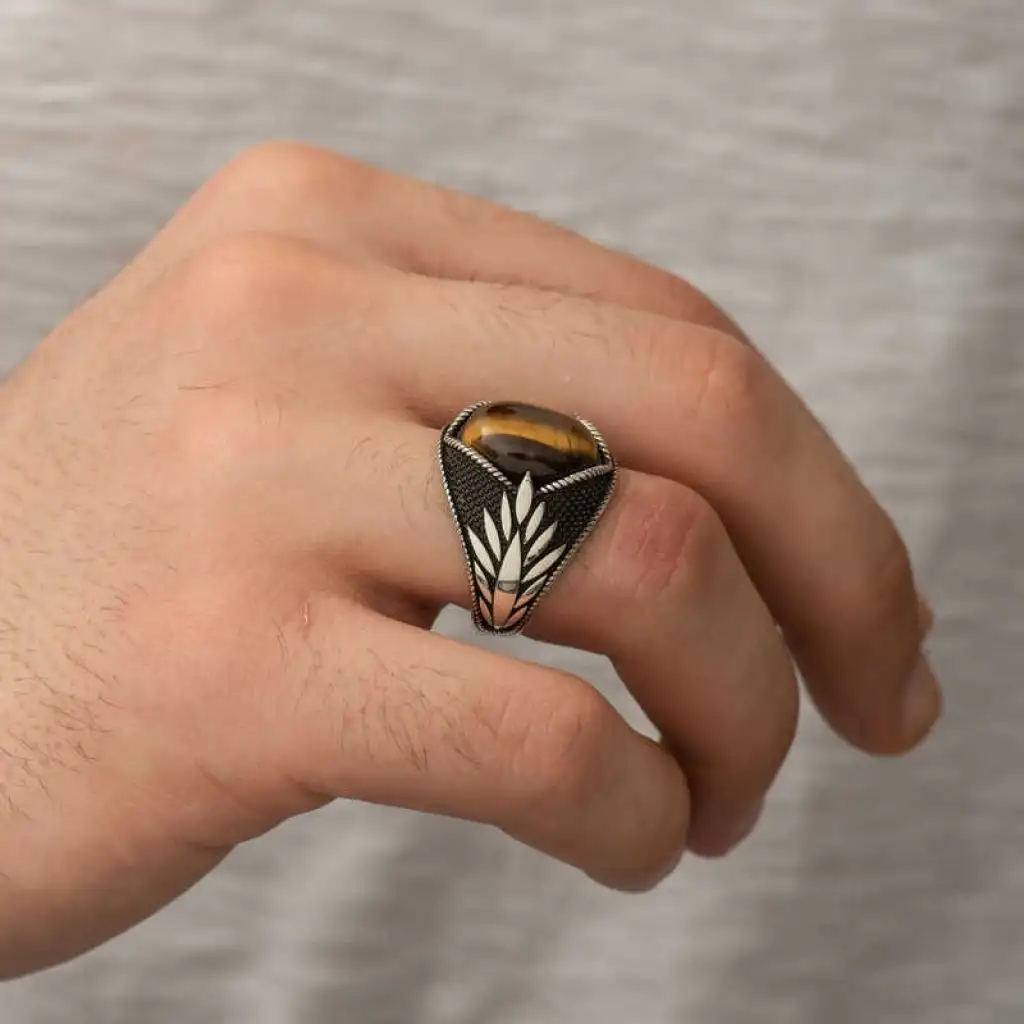 Gümüş Kaplan Gözü Taşlı İşlemeli Erkek Yüzük