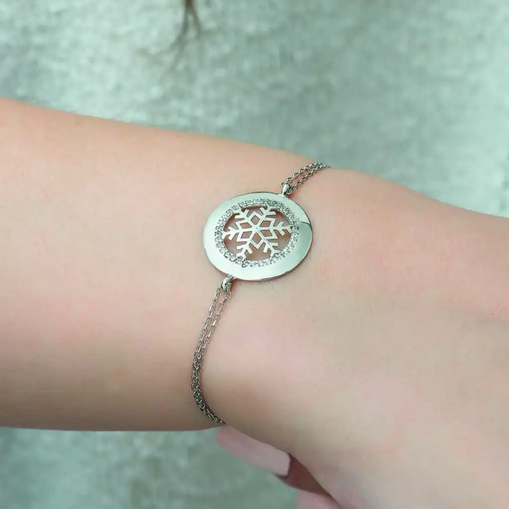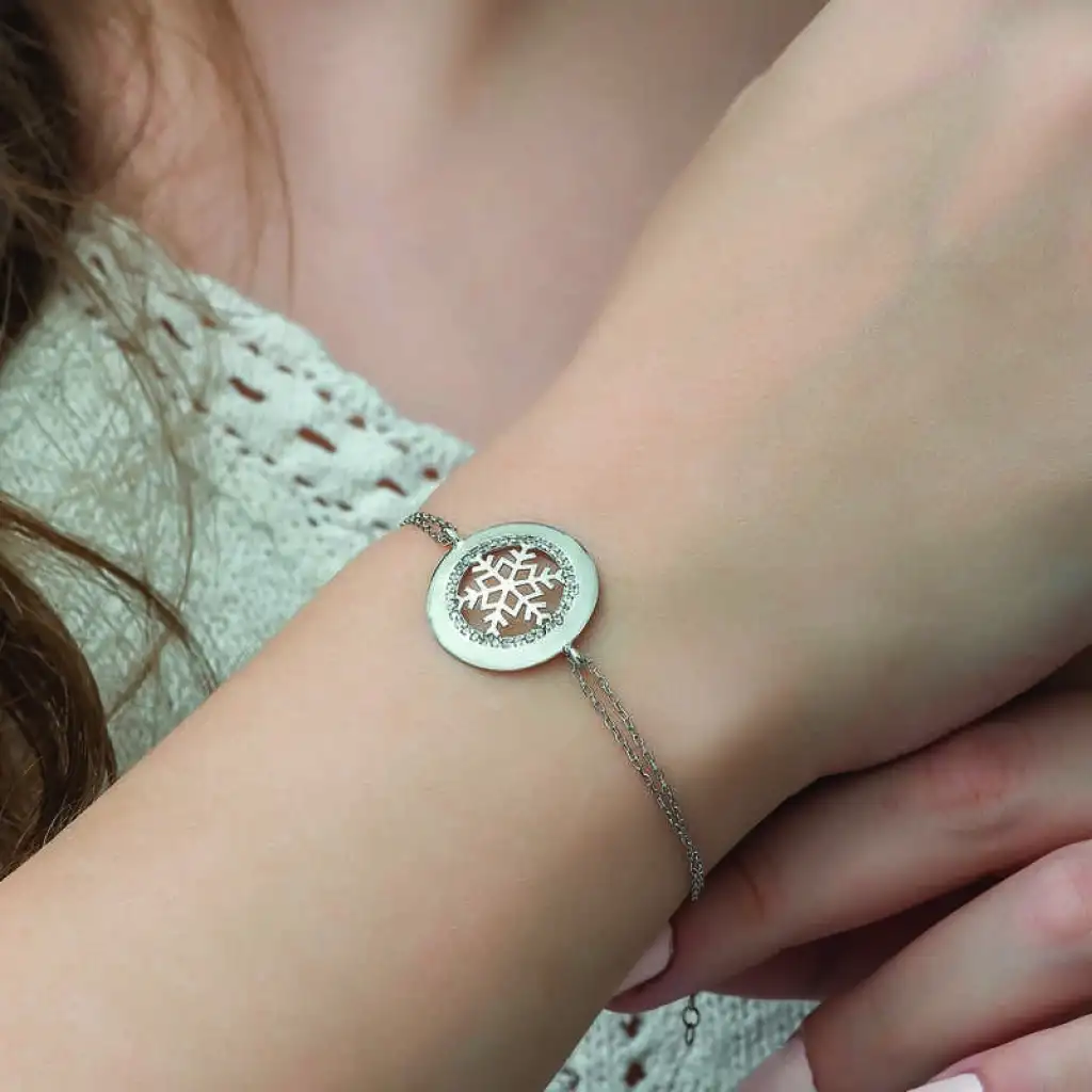Kadınların ışıltısı, berraklığı kar tanesine benzetilmektedir. Kar taneleri sevdiğiniz kişiyi sembolize etmektedir. Kar tanelerinin her birinin bayanlar gibi eşsiz ve ayrı kıymette olması onları özel kılan bir diğer özelliktir. Kar tanesinin asilliği her dönemde dikkat çekmeyi başarmıştır. Bunun yanında insanların tıpkı kar taneleri gibi birbirlerine zarar vermeden de mutlu bir şekilde yaşayabileceklerini sembolize etmektedir. Bu şık ve anlamlı bileklik; doğum günü hediyesi, sevgililer günü hediyesi veya annelere hediye olarak özel günlerde tercih edilebilecek mükemmel bir seçenektir. Bileklik, 925 ayar gümüşten imal edilmiştir. Gümüş üzerine rodyum kaplama yapılmıştır. Rodyum kaplama yapılan ürünler parlaklığını uzun süre muhafaza eder ve ürünün oksitlenmesi gecikir. Tüm gümüş bayan bilekliklerde olduğu gibi bu gümüş kar tanesi bayan bileklik de tamamı el emeği ile üretilmiştir. Gümüş ve değerli taşlar nedeniyle belirtilen ortalama ürün ağırlığında ± %10 sapma olabilmektedir.