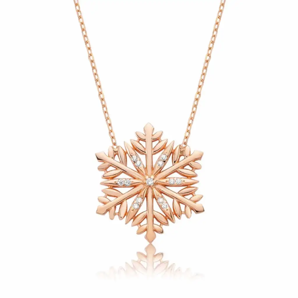 Her kar tanesinden aslında sadece bir tane var. Sevdiğiniz kişiye hediye ettiğiniz kar tanesi kolye ile onun sizin için eşsiz ve biricik olduğunu sessizce dillendirmiş oluyorsunuz. Sizlerde her zevke uygun gümüş kar tanesi bayan kolye modeli ile şıklığınıza ışıltı katın. Kar tanesi bayan kolye 925 ayar gümüşten imal edilmiştir. Gümüş üzerine rose altın kaplama yapılmıştır. Rose altın kaplama yapılan gümüş bayan kolye modelleri parlaklığını uzun süre muhafaza eder ve oksitlenmesi gecikir. Kolye üzerinde bulunan beyaz taşlar zirkondur. Gümüş olan zincir boyu ortalama 45 cm'dir. Gümüş kar tanesi bayan kolye modeli diğer kar tanesi bayan kolye modelleri gibi el emeği ile üretilmiştir. Gümüş ve değerli taşlar belirtilen nedeniyle ürün ağırlığında ± %10 sapma olabilmektedir.