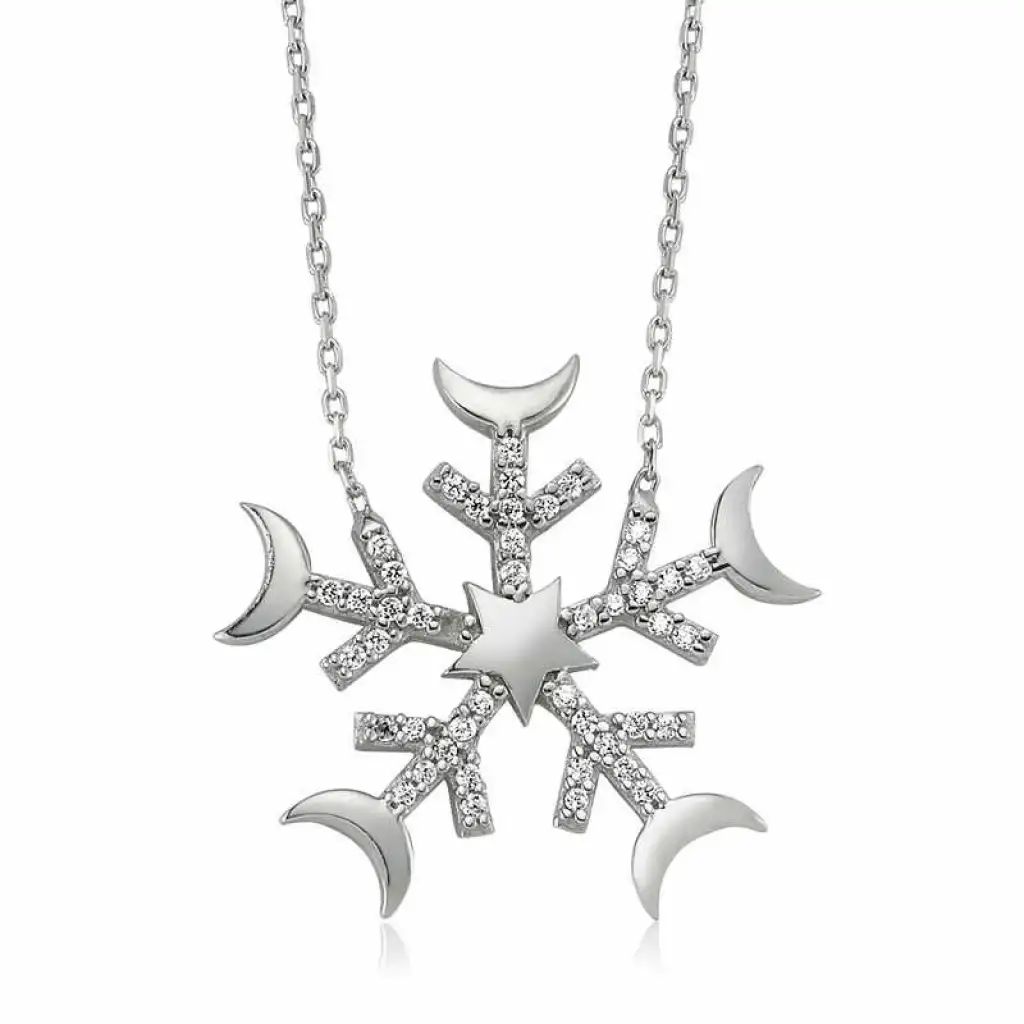 Kar yağdığında yere düşen her kar tanesi birbirinden farklıdır. Yani her bir kar tanesi eşsizdir. Sizde sevdiğinizin yeryüzünde tek olduğunu düşünüyorsanız bu kar tanesi bayan kolye çok anlamlı bir hediye olacaktır. Kar tanesi bayan kolye modeli 925 ayar gümüşten imal edilmiştir. Gümüş üzerine rodyum kaplama yapılmıştır. Rodyum kaplama yapılan gümüş bayan kolye modelleri parlaklığını uzun süre muhafaza eder ve oksitlenmesi gecikir. Kolye üzerinde bulunan beyaz taşlar zirkondur. Gümüş olan zincir boyu ortalama 45 cm'dir. Gümüş kar tanesi bayan kolye modeli diğer gümüş bayan kolye modellerinde olduğu gibi el emeği ile üretilmiştir. Gümüş ve değerli taşlar nedeniyle belirtilen ürün ağırlığında ± %10 sapma olabilmektedir.