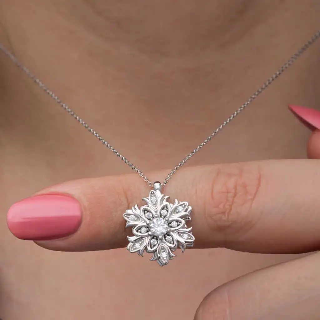 Kadınların ışıltısı, berraklığı kar tanesine benzetilip özel olarak tasarlanmıştır. Kar tanelerinin her birinin kadınlar gibi eşsiz ve ayrı kıymette olması onları özel kılan bir diğer özelliktir. Asilliği her dönemde dikkat çekmeyi başarmıştır. Bunun yanında insanların tıpkı kar taneleri gibi birbirlerine zarar vermeden de mutlu bir şekilde yaşayabileceklerini sembolize etmektedir. Bu şık kolye; doğum günü hediyesi, sevgililer günü hediyesi veya annelere hediye olarak özel günlerde tercih edilebilecek mükemmel bir seçenektir. Kolye, 925 ayar gümüşten imal edilmiştir. Gümüş üzerine rodyum kaplama yapılmıştır. Rodyum kaplama yapılan gümüş kadın kolye modelleri parlaklığını uzun süre muhafaza eder, oksitlenmesi gecikir. Zincir boyu ortalama 45 cm'dir. Tüm gümüş kadın kolye modellerinde olduğu gibi bu gümüş kar tanesi dönen stres kadın kolye de tamamı el emeği ile üretilmiştir. Gümüş ve değerli taşlar nedeniyle belirtilen ortalama ürün ağırlığında ± %10 sapma olabilmektedir.