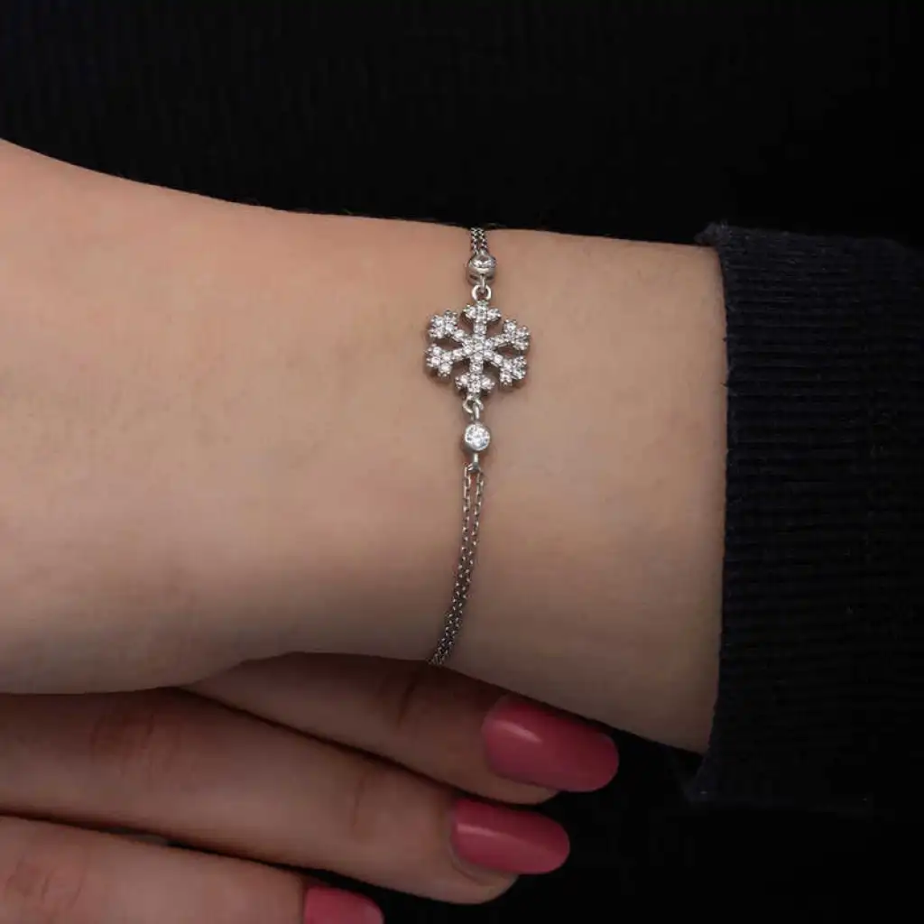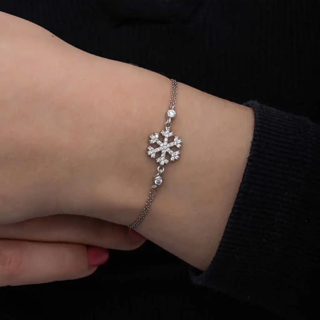 Kadınların ışıltısı, berraklığı kar tanesine benzetilip özel olarak tasarlanmıştır. Kar tanelerinin her birinin kadınlar gibi eşsiz ve ayrı kıymette olması onları özel kılan bir diğer özelliktir. Kar tanesinin asilliği her dönemde dikkat çekmeyi başarmıştır. Bunun yanında insanların tıpkı kar taneleri gibi birbirlerine zarar vermeden de mutlu bir şekilde yaşayabileceklerini sembolize etmektedir. Bu şık bileklik; doğum günü hediyesi, sevgililer günü hediyesi veya annelere hediye olarak özel günlerde tercih edilebilecek mükemmel bir seçenektir. Bileklik, 925 ayar gümüşten imal edilmiştir. Gümüş üzerine rodyum kaplama yapılmıştır. Rodyum kaplama yapılan ürünler parlaklığını uzun süre muhafaza eder ve oksitlenmesi gecikir. Tüm gümüş bilekliklerde olduğu gibi bu gümüş rodyum kar tanesi kadın bileklik de tamamı el emeği ile üretilmiştir. Gümüş ve değerli taşlar nedeniyle belirtilen ortalama ürün ağırlığında ± %10 sapma olabilmektedir.