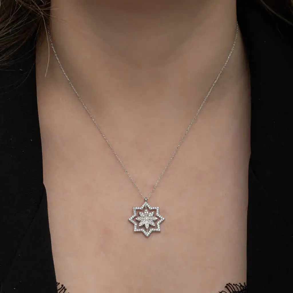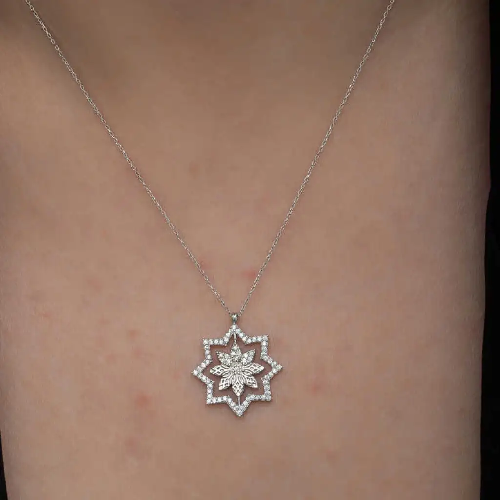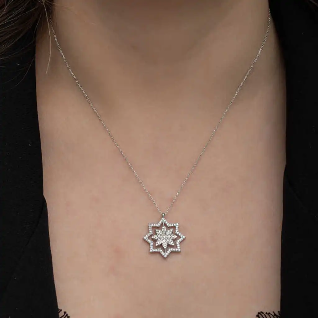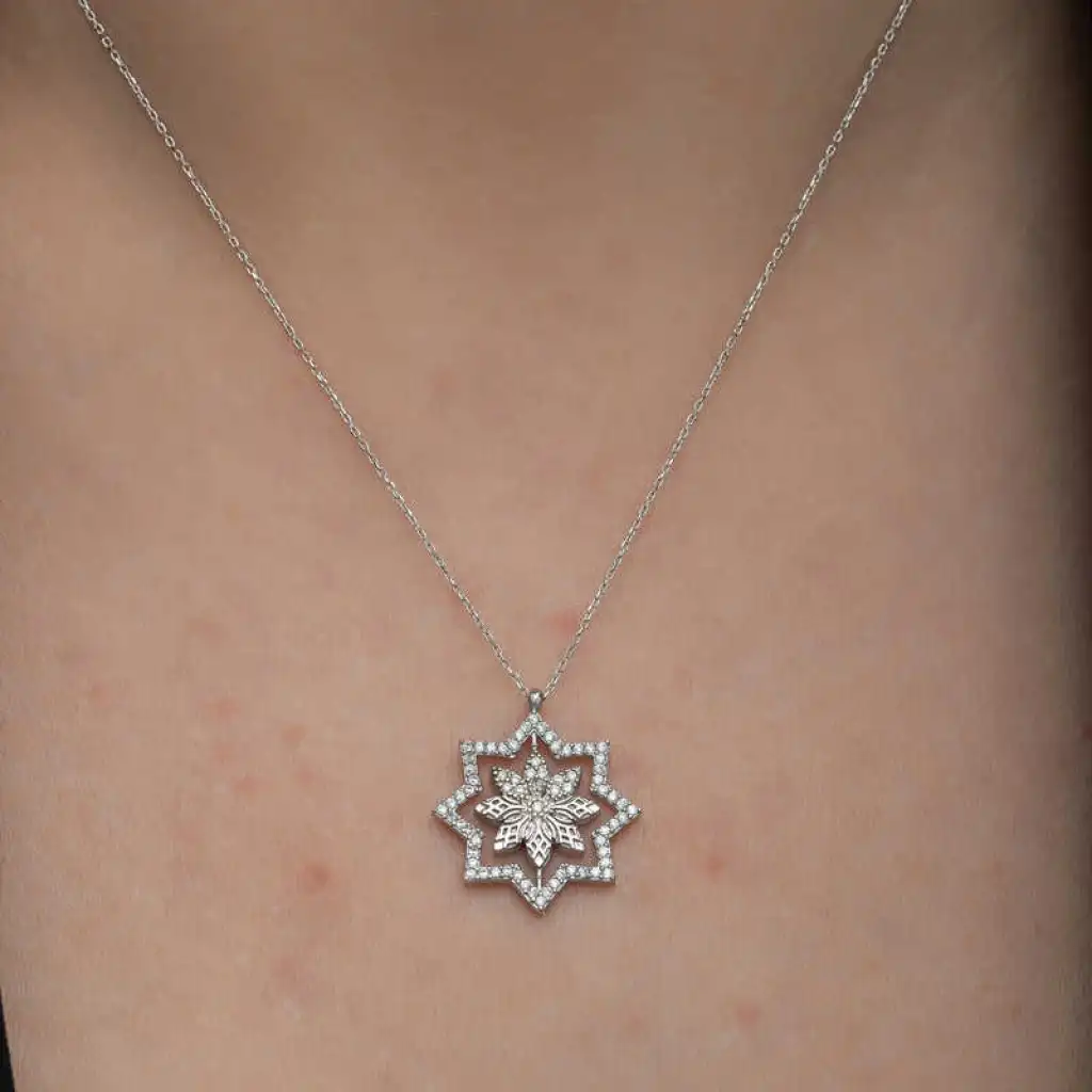 Kadınların ışıltısı, berraklığı kar tanesine benzetilip özel olarak tasarlanmıştır. Kar tanelerinin her birinin kadınlar gibi eşsiz ve ayrı kıymette olması onları özel kılan bir diğer özelliktir. Asilliği her dönemde dikkat çekmeyi başarmıştır. Bunun yanında insanların tıpkı kar taneleri gibi birbirlerine zarar vermeden de mutlu bir şekilde yaşayabileceklerini sembolize etmektedir. Bu şık kolye; doğum günü hediyesi, sevgililer günü hediyesi veya annelere hediye olarak özel günlerde tercih edilebilecek mükemmel bir seçenektir. Kolye, 925 ayar gümüşten imal edilmiştir. Gümüş üzerine rodyum kaplama yapılmıştır. Rodyum kaplama yapılan gümüş kadın kolye modelleri parlaklığını uzun süre muhafaza eder, oksitlenmesi gecikir. Zincir boyu ortalama 45 cm'dir. Tüm gümüş kadın kolye modellerinde olduğu gibi bu gümüş kar tanesi kadın kolye de tamamı el emeği ile üretilmiştir. Gümüş ve değerli taşlar nedeniyle belirtilen ortalama ürün ağırlığında ± %10 sapma olabilmektedir.