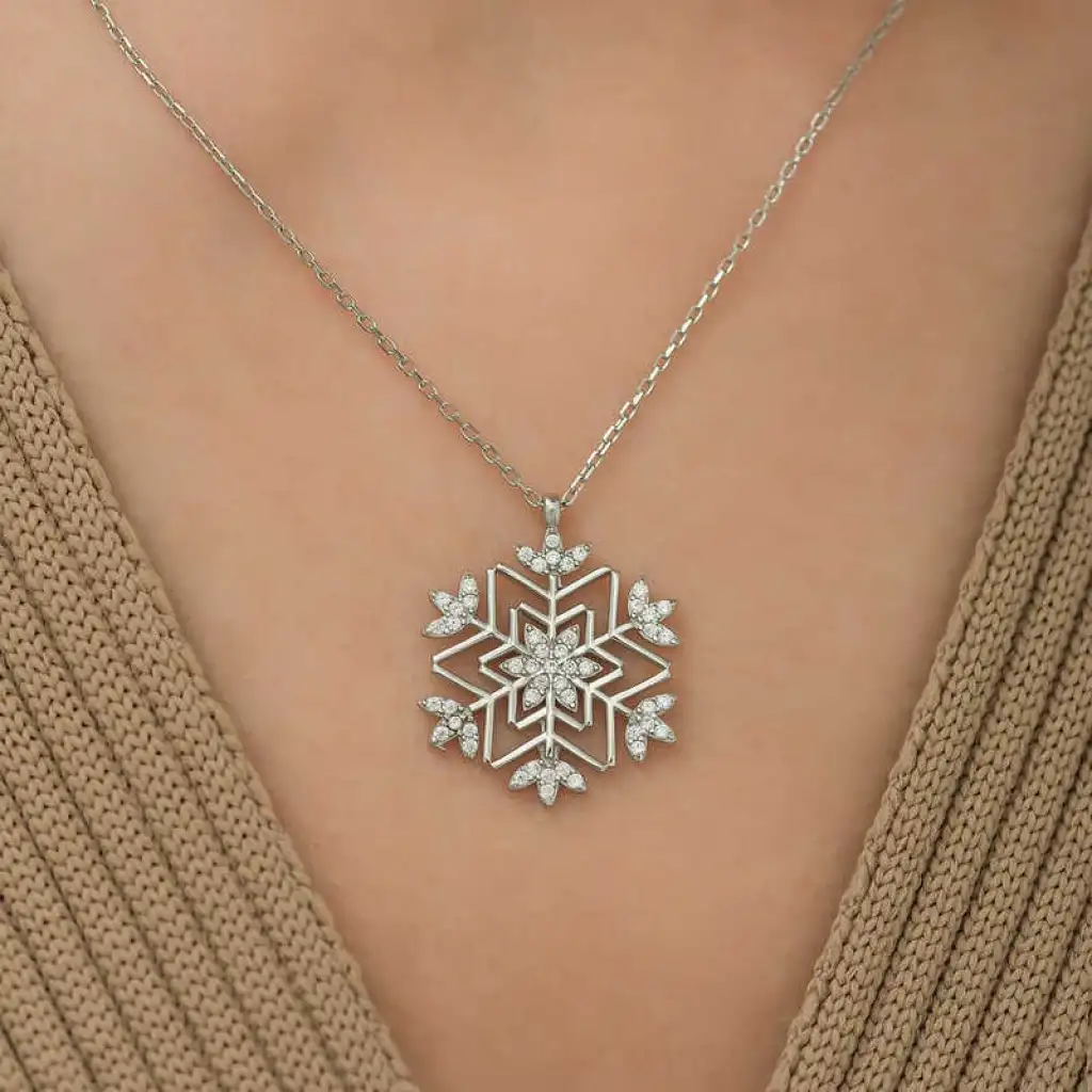 Kadınların ışıltısı, berraklığı kar tanesine benzetilip özel olarak tasarlanmıştır. Kar tanelerinin her birinin bayanlar gibi eşsiz ve ayrı kıymette olması onları özel kılan bir diğer özelliktir. Asilliği her dönemde dikkat çekmeyi başarmıştır. Bunun yanında insanların tıpkı kar taneleri gibi birbirlerine zarar vermeden de mutlu bir şekilde yaşayabileceklerini sembolize etmektedir. Bu şık kolye; doğum günü hediyesi, sevgililer günü hediyesi veya annelere hediye olarak özel günlerde tercih edilebilecek mükemmel bir seçenektir. Kolye, 925 ayar gümüşten imal edilmiştir. Gümüş üzerine rodyum kaplama yapılmıştır. Rodyum kaplama yapılan ürünler parlaklığını uzun süre muhafaza eder ve oksitlenmesi gecikir. Tüm gümüş bayan kolyelerde olduğu gibi bu gümüş kar tanesi bayan kolye de tamamı el emeği ile üretilmiştir. Gümüş ve değerli taşlar nedeniyle belirtilen ortalama ürün ağırlığında ± %10 sapma olabilmektedir.