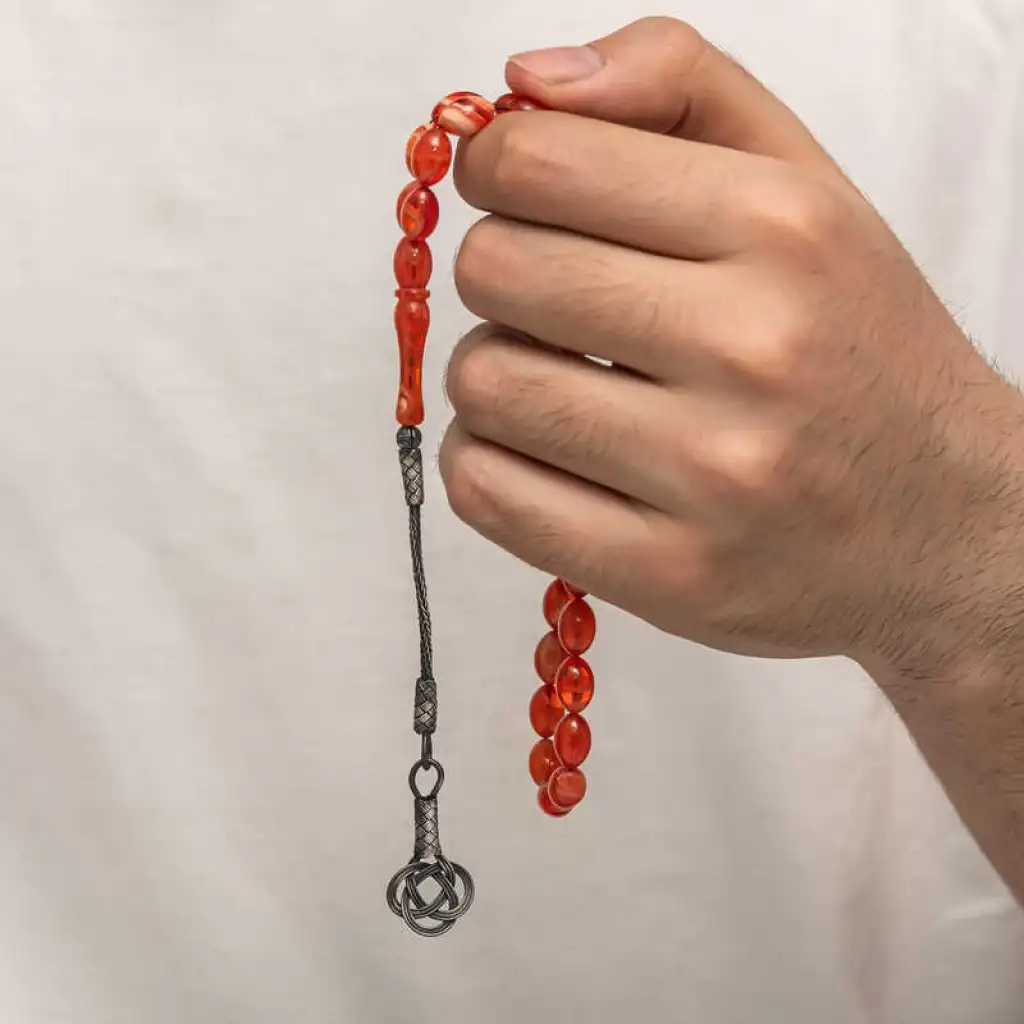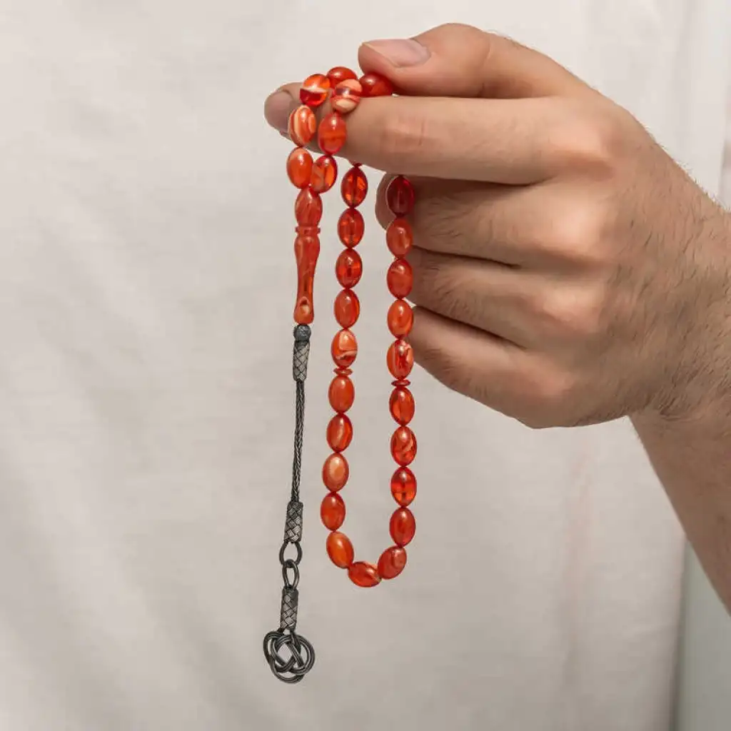 Kehribar, çam ağacı reçinesinin toprak altında uzun yıllar boyunca birikerek oluşan bir maddedir. Hemen hemen taş ile aynı sertliktedir fakat yoğunluğu düşüktür. Çam kokusu yayar. Oluşumu uzun zaman aldığından ve yapay olarak yapılamadığından değerli bir maddedir. Sıkma kehribar ise kehribar taşından farklı olarak onun özelliklerini taşıyan, görüntü itibariyle ona benzeyen fakat gerçek olmayan bir malzemedir. Ülkemizde ve dünyanın bir çok yerinde kehribar taşından çeşitli malzemeler üretilmiştir. Ülkemizde en yaygın olarak tesbih üretilmektedir. Kehribar tesbihler elde ısındıkça kehribar benzeri bir koku verir ve renk değiştirir. Bir çok rengi vardır. Hatta iki rengin birleşiminden oluşan kehribar tesbih modelleri de vardır. Genellikle gümüş püskül ile kullanılır veya sistemli olarak da kullanılabilir. Ülkemizin güzide tesbih ustaları bu malzemeyi sıklıkla işlemek suretiyle çeşitli sanat eserleri meydana getirirler. Bu tesbihler de koleksiyonerler tarafından alınıp satılmaktadır. Gümüş 1000 ayar kazaz püsküllü sıkma kehribar tesbih modeli de günlük hayatta kullanılabilecek çok şık bir tesbih çeşididir. Özel günlerin vazgeçilmez hediyesi sıkma kehribar tesbihler erkekler için doğum günü, sevgililer günü ve babalar günü gibi özel zamanlarda hediye olarak tercih edilebilir. Gümüş kazaz püsküllü sıkma kehribar tesbih modeli diğer kehribar tesbih modellerinde olduğu gibi tamamen el emeği ile imal edilmiştir.