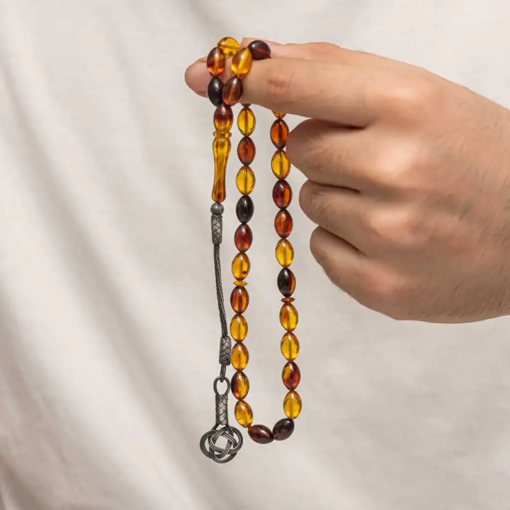 Kehribar, çam ağacı reçinesinin toprak altında uzun yıllar boyunca birikerek oluşan bir maddedir. Hemen hemen taş ile aynı sertliktedir fakat yoğunluğu düşüktür. Çam kokusu yayar. Oluşumu uzun zaman aldığından ve yapay olarak yapılamadığından değerli bir maddedir. Sıkma kehribar ise kehribar taşından farklı olarak onun özelliklerini taşıyan, görüntü itibariyle ona benzeyen fakat gerçek olmayan bir malzemedir. Ülkemizde ve dünyanın bir çok yerinde kehribar taşından çeşitli malzemeler üretilmiştir. Ülkemizde en yaygın olarak tesbih üretilmektedir. Kehribar tesbihler elde ısındıkça kehribar benzeri bir koku verir ve renk değiştirir. Bir çok rengi vardır. Hatta iki rengin birleşiminden oluşan kehribar tesbih modelleri de vardır. Genellikle gümüş püskül ile kullanılır veya sistemli olarak da kullanılabilir. Ülkemizin güzide tesbih ustaları bu malzemeyi sıklıkla işlemek suretiyle çeşitli sanat eserleri meydana getirirler. Bu tesbihler de koleksiyonerler tarafından alınıp satılmaktadır. Gümüş 1000 ayar kazaz püsküllü sıkma kehribar tesbih modeli de günlük hayatta kullanılabilecek çok şık bir tesbih çeşididir. Özel günlerin vazgeçilmez hediyesi sıkma kehribar tesbihler erkekler için doğum günü, sevgililer günü ve babalar günü gibi özel zamanlarda hediye olarak tercih edilebilir. Gümüş kazaz püsküllü sıkma kehribar tesbih modeli diğer kehribar tesbih modellerinde olduğu gibi tamamen el emeği ile imal edilmiştir.