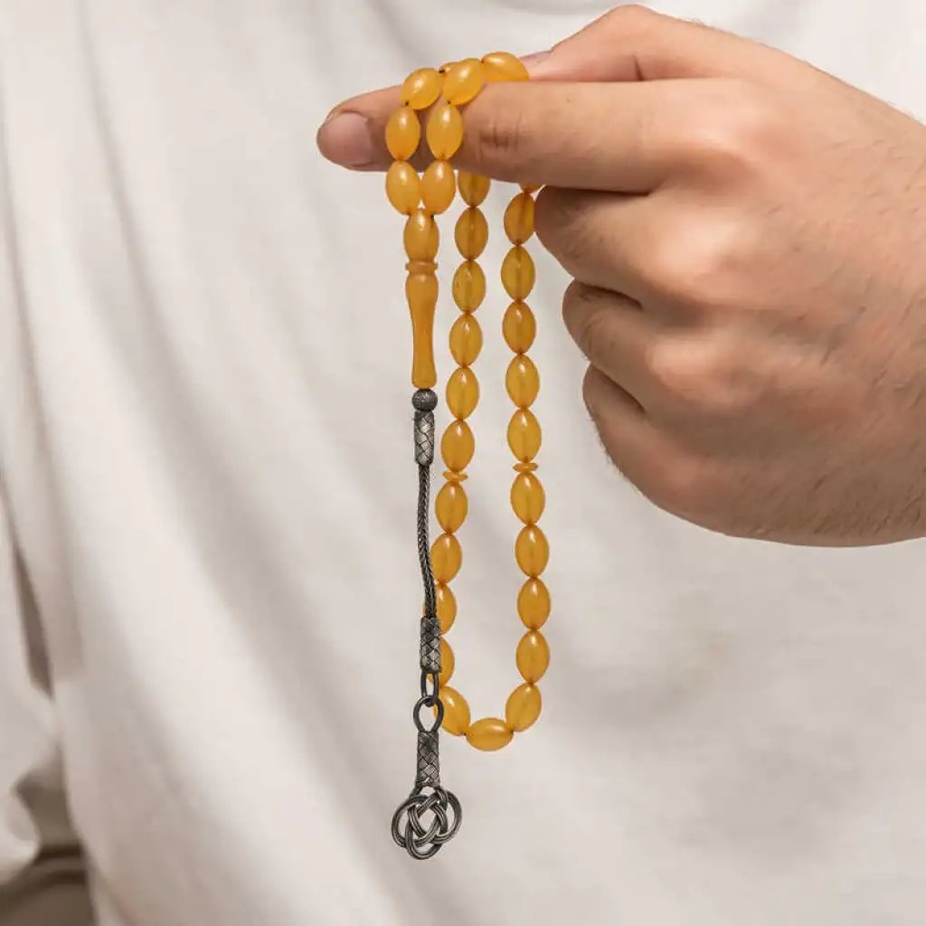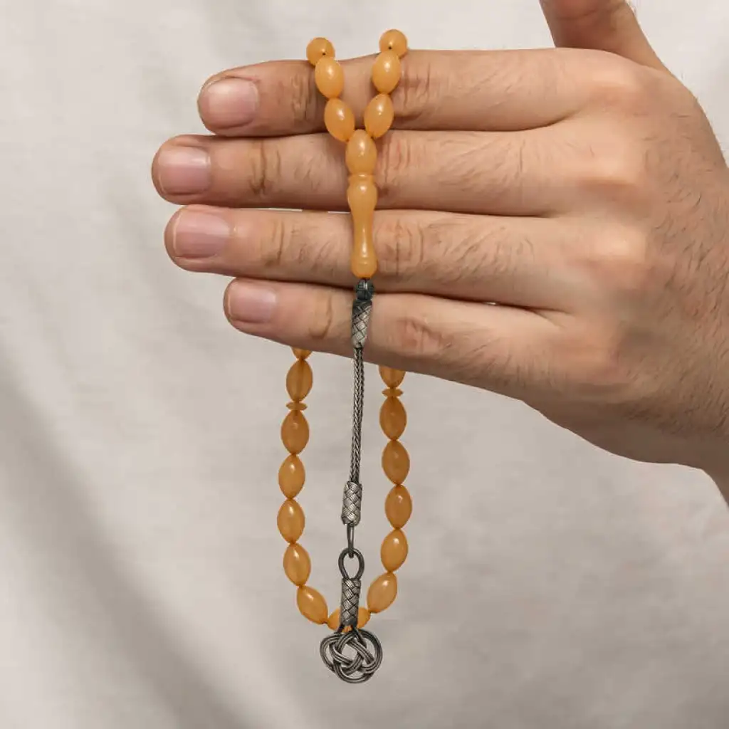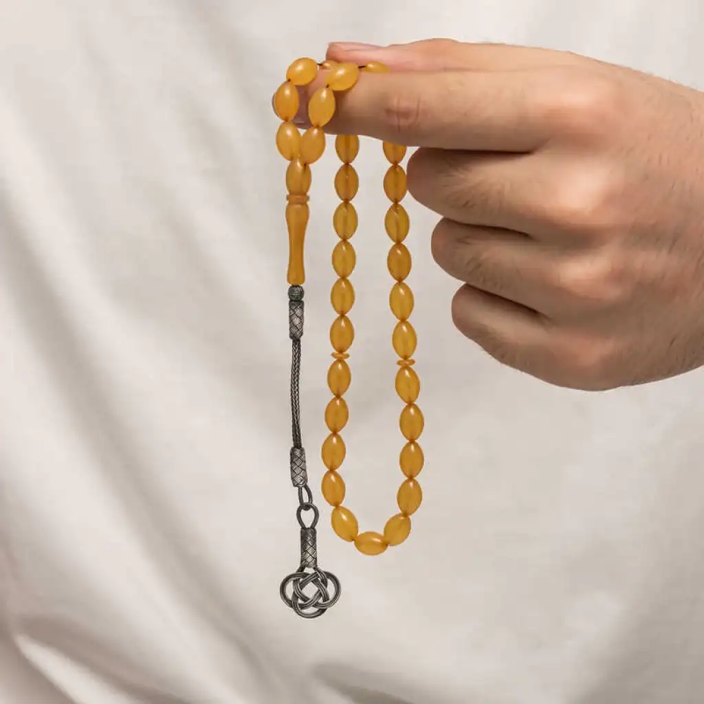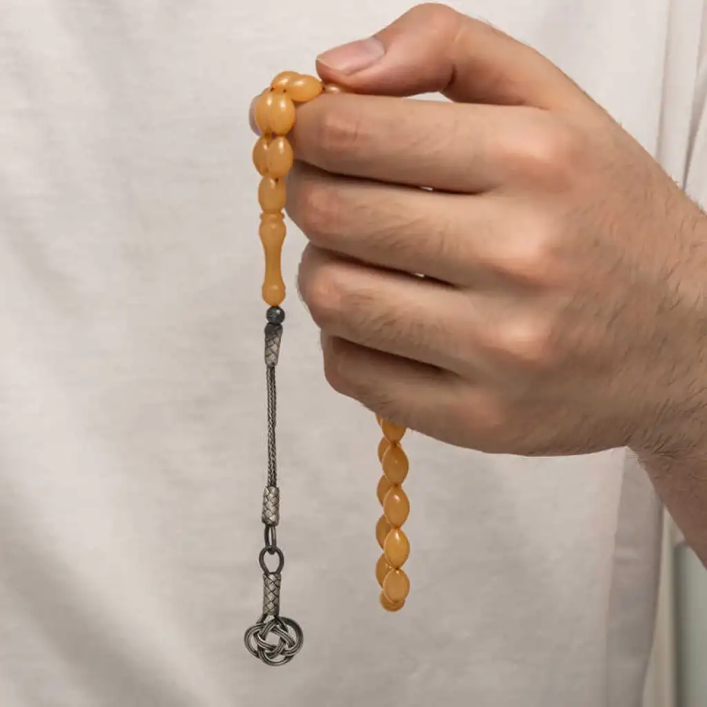 Kehribar, çam ağacı reçinesinin toprak altında uzun yıllar boyunca birikerek oluşan bir maddedir. Hemen hemen taş ile aynı sertliktedir fakat yoğunluğu düşüktür. Çam kokusu yayar. Oluşumu uzun zaman aldığından ve yapay olarak yapılamadığından değerli bir maddedir. Sıkma kehribar ise kehribar taşından farklı olarak onun özelliklerini taşıyan, görüntü itibariyle ona benzeyen fakat gerçek olmayan bir malzemedir. Ülkemizde ve dünyanın bir çok yerinde kehribar taşından çeşitli malzemeler üretilmiştir. Ülkemizde en yaygın olarak tesbih üretilmektedir. Kehribar tesbihler elde ısındıkça kehribar benzeri bir koku verir ve renk değiştirir. Bir çok rengi vardır. Hatta iki rengin birleşiminden oluşan kehribar tesbih modelleri de vardır. Genellikle gümüş püskül ile kullanılır veya sistemli olarak da kullanılabilir. Ülkemizin güzide tesbih ustaları bu malzemeyi sıklıkla işlemek suretiyle çeşitli sanat eserleri meydana getirirler. Bu tesbihler de koleksiyonerler tarafından alınıp satılmaktadır. Gümüş 1000 ayar kazaz püsküllü sıkma kehribar tesbih modeli de günlük hayatta kullanılabilecek çok şık bir tesbih çeşididir. Özel günlerin vazgeçilmez hediyesi sıkma kehribar tesbihler erkekler için doğum günü, sevgililer günü ve babalar günü gibi özel zamanlarda hediye olarak tercih edilebilir. Gümüş kazaz püsküllü sıkma kehribar tesbih modeli diğer kehribar tesbih modellerinde olduğu gibi tamamen el emeği ile imal edilmiştir.