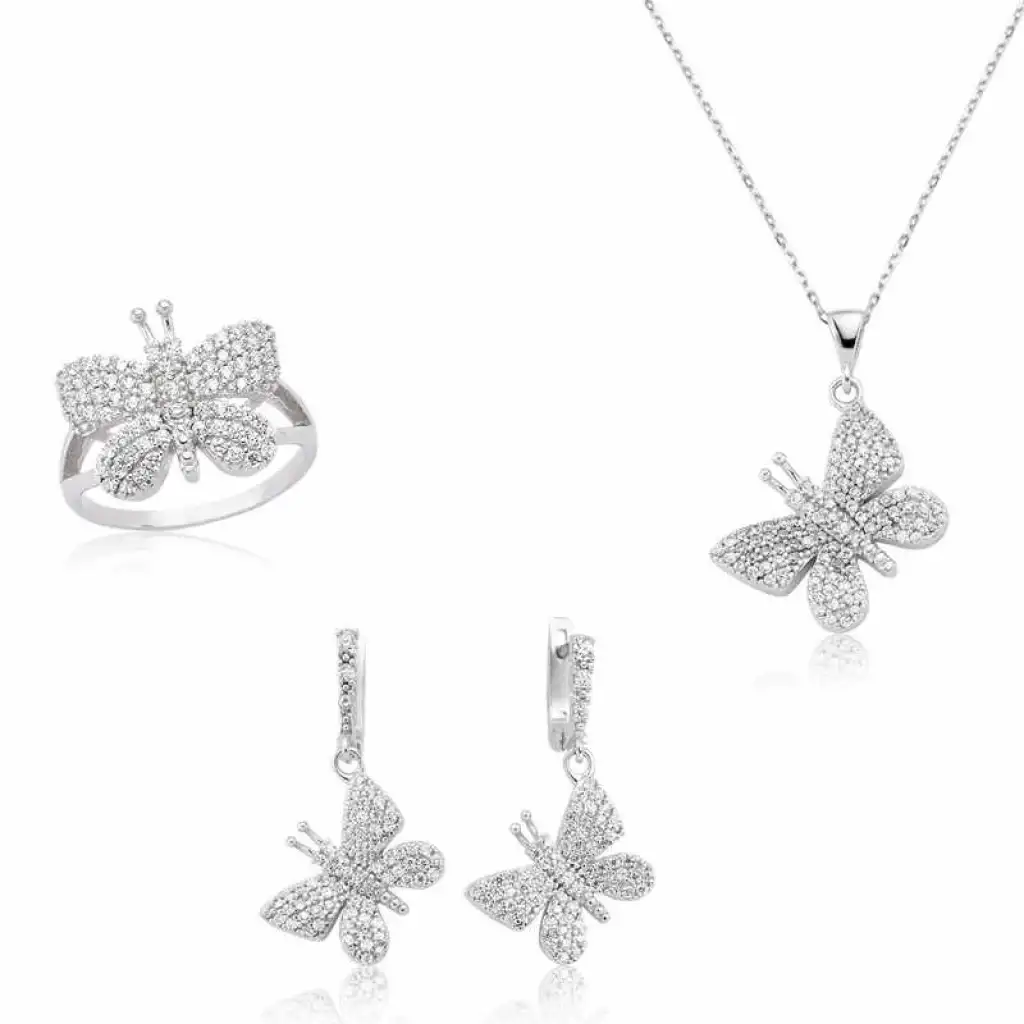 Özgürlüğü masumiyeti ve saflığı simgeleyen kelebekler, tertemiz sevginin ve aşkın ifadesidir. Bahar kelebekleri anlam itibari ile aşkın küçük bir kıvılcım ile başladığı daha sonra büyük bir sabır ile büyüdüğü ve en sonunda ilan-ı aşkı ifade eder. Bu harika set; doğum günü hediyesi, sevgililer günü hediyesi veya annelere hediye olarak özel günlerde tercih edilebilecek mükemmel bir seçenektir. Bu şık set 925 ayar gümüşten imal edilmiştir. Gümüş üzerine rodyum kaplama yapılmıştır. Rodyum kaplama yapılan gümüş bayan setler parlaklığını uzun süre muhafaza eder ve oksitlenmeyi geciktirir. Üzerinde bulunan taşlar zirkondur. Zincir boyu ortalama 45 cm'dir. Tüm gümüş bayan setlerde olduğu gibi gümüş kelebek bayan set de el emeği ile üretilmiştir. Gümüş ve değerli taşlar nedeniyle belirtilen ortalama ürün ağırlığında ± %10 sapma olabilmektedir.