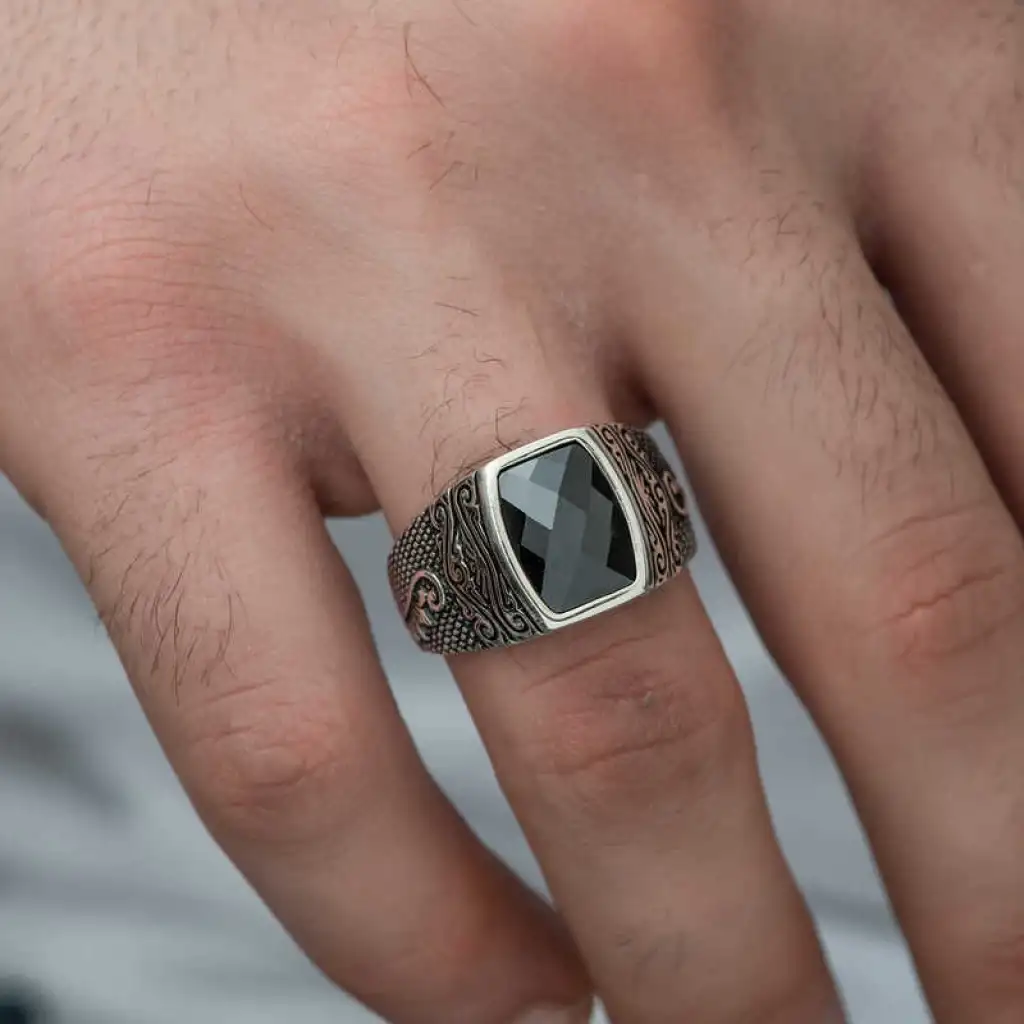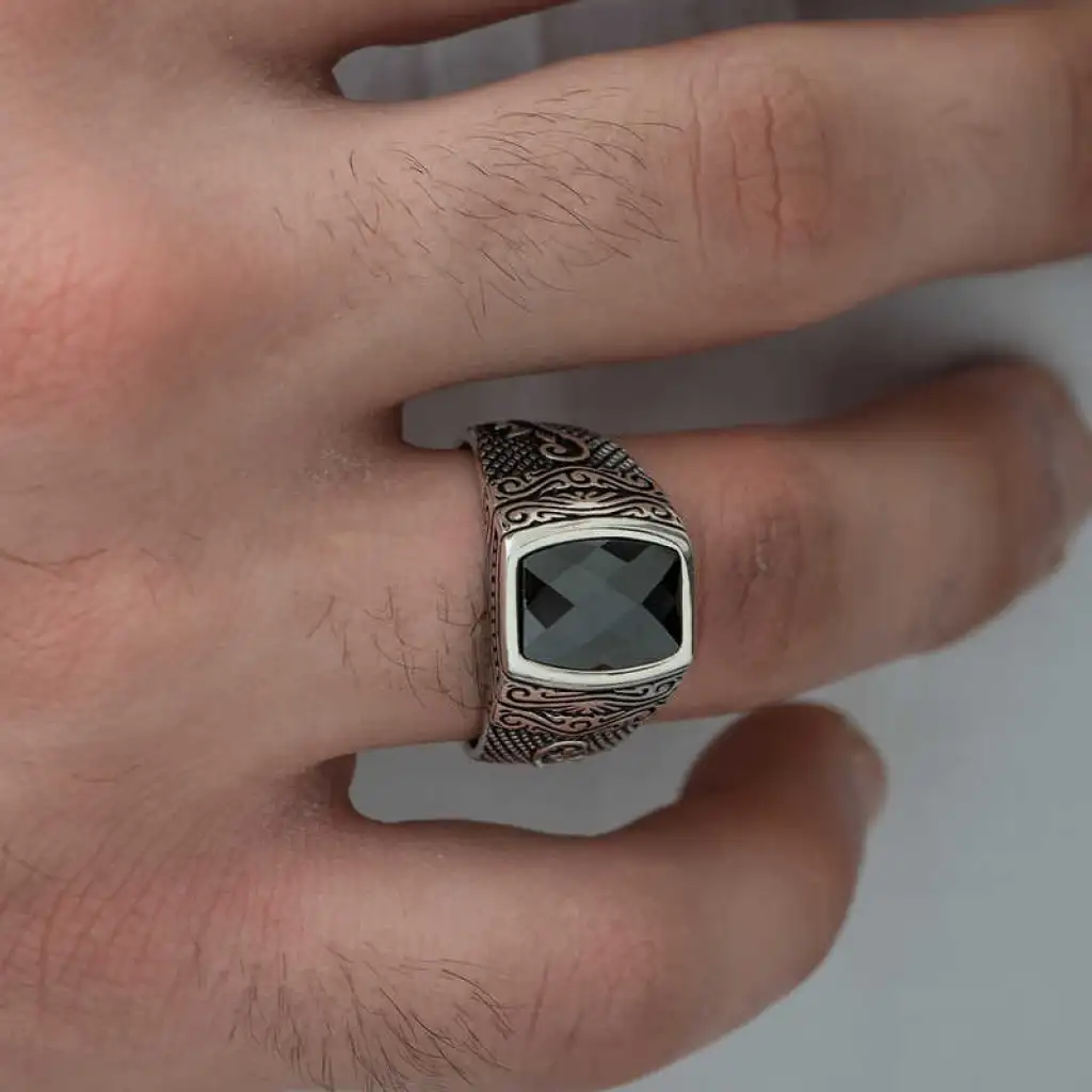 En kaliteli ve şık erkek takılarını, yeni modelleri ile erkeklerin beğenisine sunuyoruz. Bir kadını etkilemenin yolu neden hoş bir yüzük olmasın? Gümüş siyah kesme taşlı erkek yüzük modeli özel olarak el işçiliği ile yapılmıştır. Bu şık gümüş erkek yüzüğü siz de parmağınızda taşımaktan ve dostlarınıza hediye etmekten mutluluk duyabilirsiniz. Bu şık yüzük modeli 925 ayar gümüşten imal edilmiştir. Gümüş üzerine oksit kaplama yapılmıştır. Oksit kaplama yapılan gümüş erkek yüzük modelleri otantik bir görünüme sahip olur. Gümüş erkek yüzük modellerinin tamamında olduğu gibi kesme taşlı desenli erkek yüzük modeli de tamamen el emeği ile üretilmiştir. Gümüş ve değerli taşlar nedeniyle belirtilen ortalama ürün ağırlığında ± %10 sapma olabilmektedir.