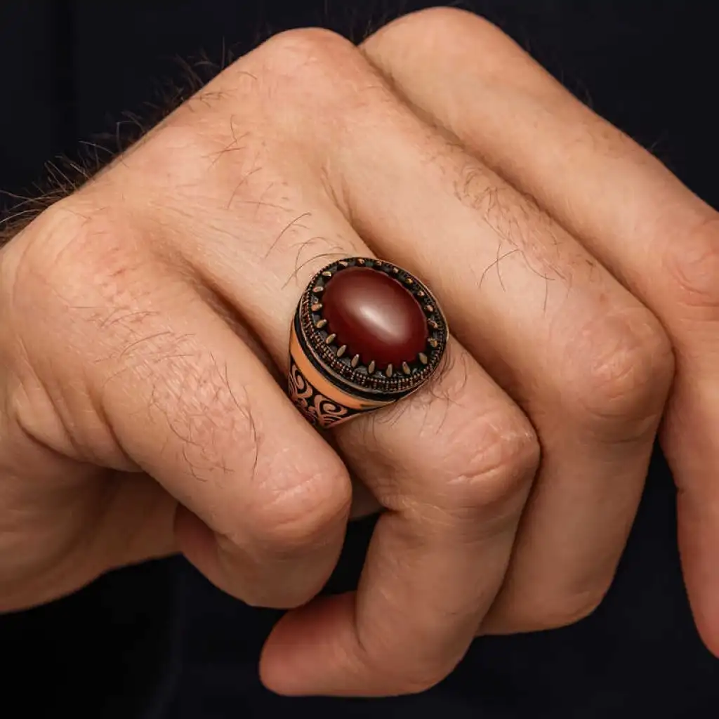 Kırmızı akik taşı, genellikle cesaret, güç ve koruma sembolü olarak kabul edilir. Erkek yüzüğünde kullanılan kırmızı akik, sahip olduğu canlı rengiyle dikkat çekici bir görünüm sunarken, aynı zamanda taşıyan kişiye içsel güç ve enerji verme özelliğiyle de bilinir.Kendinize yada sevdiklerinize doğum gününde, babalar gününde yada özel günlerde hediye edebilirsiniz. Gümüş üzerine oksit kaplama yapılmıştır. Oksit kaplama yapılan gümüş erkek yüzük modelleri parlaklığını uzun süre muhafaza eder, oksitlenmesi gecikir. Gümüş ve değerli taşlar nedeniyle belirtilen ortalama ürün ağırlığında ± %10 sapma olabilmektedir.
