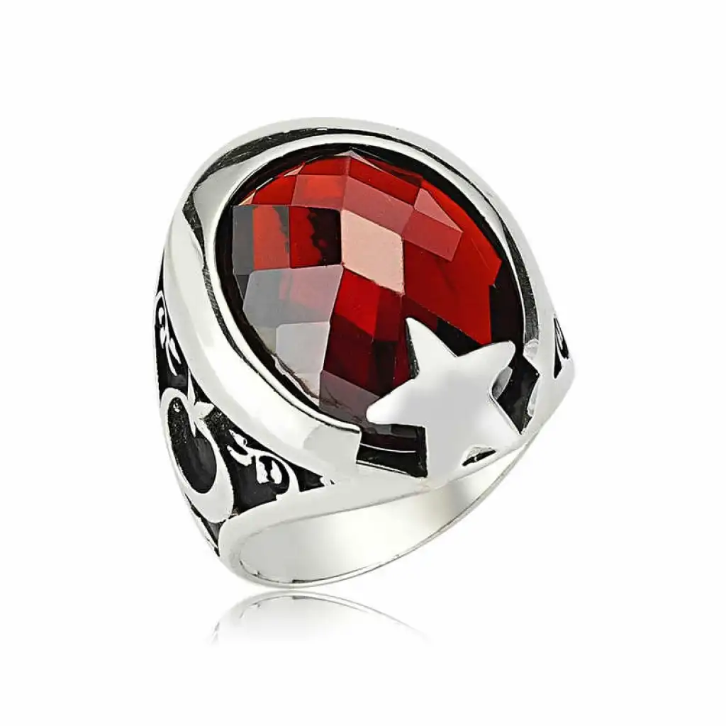 Gümüş Kırmızı Taşlı Ay Yıldız Erkek Yüzük