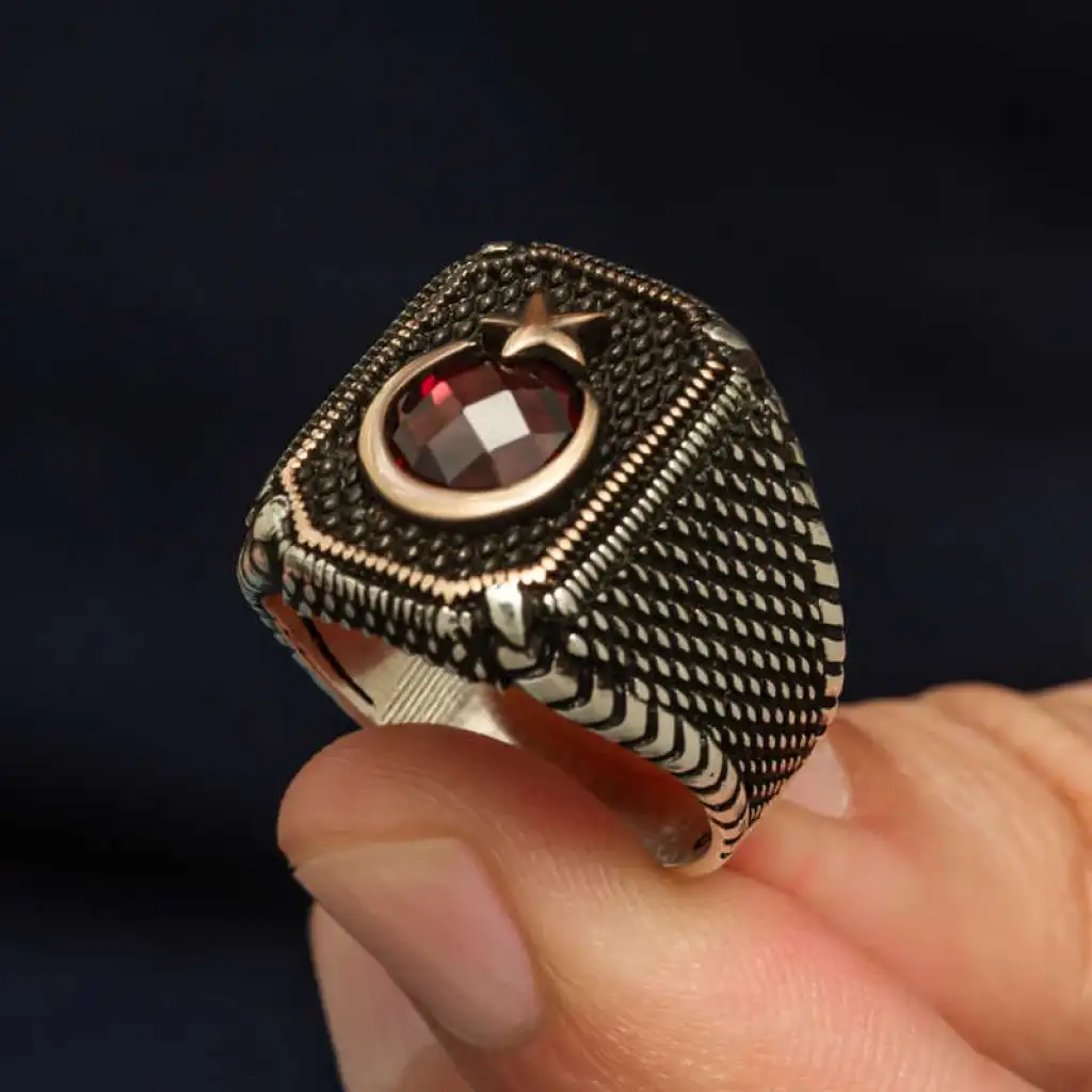 Gümüş Kırmızı Taşlı Ay Yıldız Erkek Yüzük