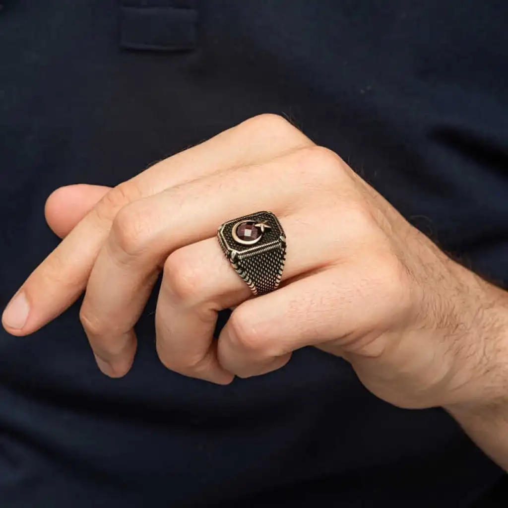Şıklığı ve anlamlı tasarımıyla öne çıkan bu erkek yüzük,üstün kalite gümüş kullanılarak işlenmiştir.Zarif ay ve yıldız motifleriyle süslenmiş bu yüzük,göz alıcı kırmızı taş detaylarıyla tamamlanmıştır.Her detayında özen ve ustalık barındıran bu aksesuar,stilini tamamlamak isteyen erkekler için mükemmel bir tercih.Kendinize yada sevdiklerinize doğum gününde,babalar gününde yada özel günlerde hediye edebilirsiniz. Gümüş üzerine oksit kaplama yapılmıştır. Oksit kaplama yapılan gümüş erkek yüzük modelleri parlaklığını uzun süre muhafaza eder, oksitlenmesi gecikir. Gümüş ve değerli taşlar nedeniyle belirtilen ortalama ürün ağırlığında ± %10 sapma olabilmektedir.
