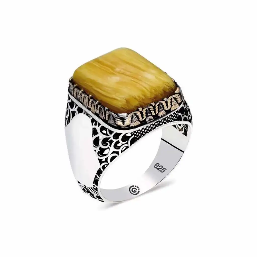 Gümüş Sıkma Koyu Sarı Kehribar Taşlı Kare Erkek Yüzük