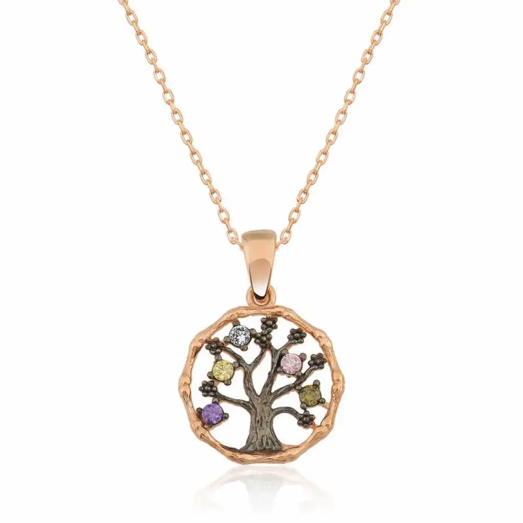 Hayat ağacı yeni bir yaşamı sembolize ediyor. Bunun yanında dünyada iz bırakmak, soyunu devam ettirme amacı yani ailenin simgesi anlamına gelmektedir. Bu şık kolye; 925 ayar gümüşten imal edilmiştir. Gümüş üzerine rose altın kaplama yapılmıştır. Rose altın kaplama yapılan ürünler parlaklığını uzun süre muhafaza eder, gümüşü pembe renge dönüştürür ve oksitlenmeyi geciktirir. Üzerinde bulunan taşlar zirkondur. Gümüş olan zincirin boyu ortalama 45 cm'dir. Tüm gümüş bayan kolyelerde olduğu gibi gümüş küçük hayat ağacı bayan kolye de el emeği ile üretilmiştir. Gümüş ve değerli taşlar nedeniyle belirtilen ürün ağırlığında ± %10 sapma olabilmektedir.