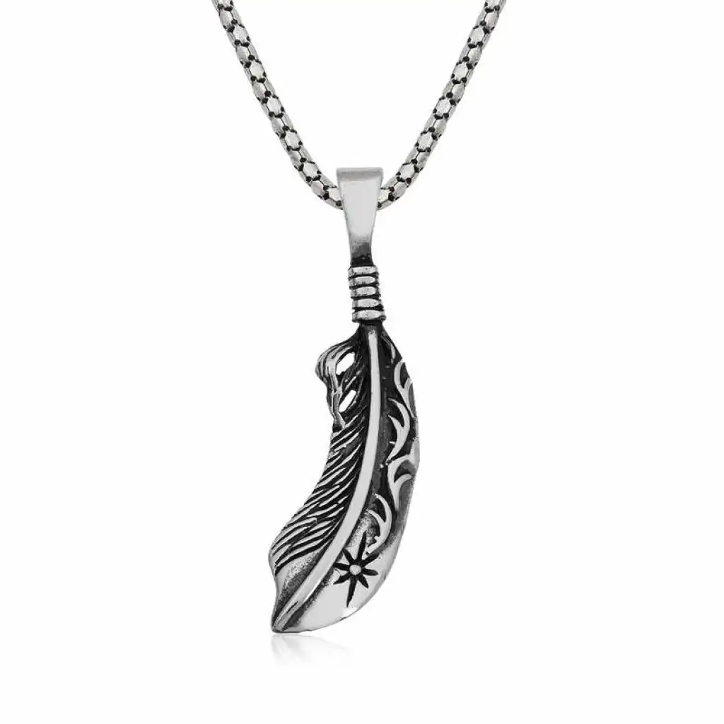 Kuş tüyünün özellikle eski Mısır, Maya, İnka, Amerika kızılderilileri ve Asya Şamanizminde önemli bir yeri vardır. İlahlar, krallar ve kahramanlar için kullanılan tüy, kuş sembolüyle birçok anlamı paylaşır ve genellikle, hakikatin, doğruluğun, ilâhî adaletin, hafifliğin ve göğe çıkmada kuşlara en büyük yardımcı unsur olduğundan yükselmenin sembolü olarak kabul edilir. Sizin olduğu kadar sevdiklerinizin de keyifle takacağı bu tüy kolye modeli en güzel hediyelerden biri olacaktır. Kuş tüyü kolye modeli 925 ayar gümüşten imal edilmiştir. Gümüş üzerine oksit kaplama yapılmıştır. Oksit kaplama yapılan gümüş kolye modelleri parlaklığını uzun süre muhafaza eder ve oksitlenmesi gecikir. Gümüş kolyenin zincir uzunluğu ortalama 55 cm'dir. Tüm kolye modellerinde olduğu gibi gümüş kuş tüyü kolye modeli de el emeği ile üretilmiştir. Gümüş ve değerli taşlar nedeniyle belirtilen ortalama ürün ağırlığında ± %10 sapma olabilmektedir.