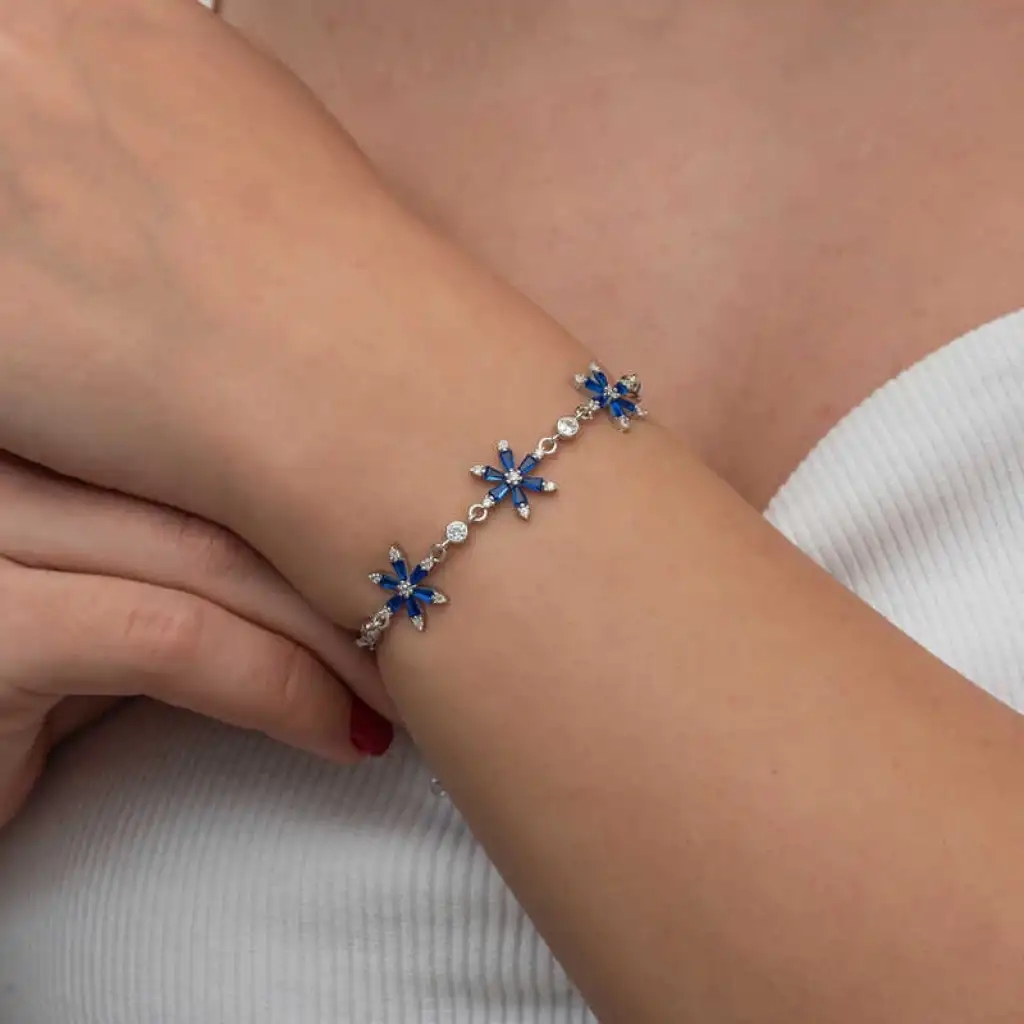 Lacivert lotus çiçeği kadın bilekliği, zarif tasarımıyla öne çıkan şık bir aksesuardır. Lotus çiçeği, saflığı ve yeniden doğuşu simgileyen anlamıyla, kullanıcısına ruhsal bir huzur sunar. Lacivert rengi, derinlik ve zarafet katarken, her ortamda şıklığınızı ön plana çıkarır.Lotus çiçeği kadın bileklik modeli 925 ayar gümüşten imal edilmiştir. Gümüş üzerine rodyum kaplama yapılmıştır. Rodyum kaplama yapılan lacivert lotus çiçeği kadın bileklik modelleri parlaklığını uzun süre muhafaza eder. Gümüş kadın bileklik modellerinin tamamında olduğu gibi gümüş lotus çiçeği kadın bileklik modeli de el emeği ile üretilmiştir. Gümüş ve değerli taşlar nedeniyle belirtilen ortalama ürün ağırlığında ± %10 sapma olabilmektedir.