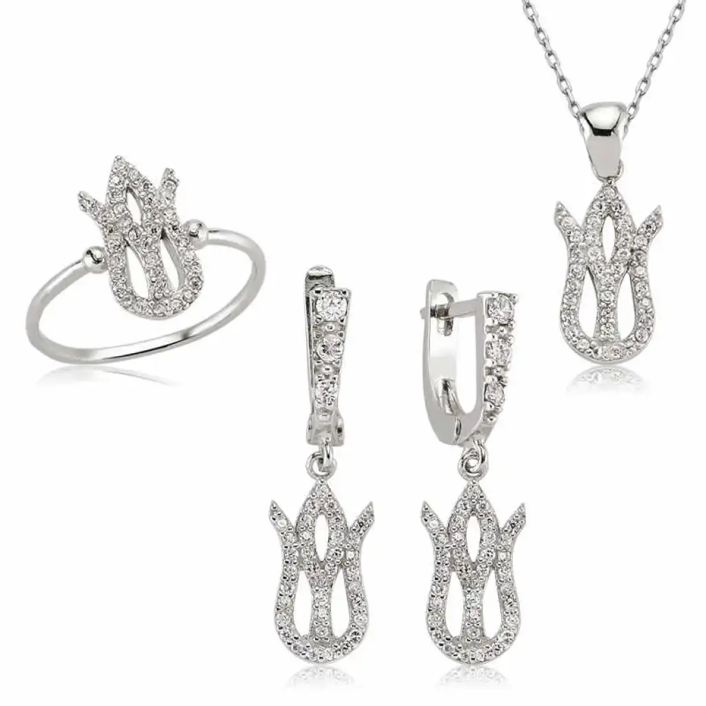 Lale; rengi ve şekli itibariyle “sevgilinin yüzüne, yanağına ve dudağına” benzetilen eşsiz bir çiçektir, aşkı ve sevgiliyi sembolize eder. Bu güzelliklerin yanında birde lale tasavvufta Allah’ın birliğini temsil eder... Bu şık set; doğum günü hediyesi, sevgililer günü hediyesi veya annelere hediye olarak özel günlerde tercih edilebilecek mükemmel bir seçenektir. Gümüş lale bayan set, 925 ayar gümüşten imal edilmiştir. Gümüş üzerine rodyum kaplama yapılmıştır. Rodyum kaplama yapılan gümüş lale bayan set parlaklığını uzun süre muhafaza eder ve oksitlenmesi gecikir. Üzerinde bulunan taşlar zirkondur. Zincir boyu ortalama 45 cm'dir. Tüm bayan setlerde olduğu gibi gümüş lale bayan set de el emeği ile üretilmiştir. Gümüş ve değerli taşlar nedeniyle belirtilen ortalama ürün ağırlığında ± %10 sapma olabilmektedir.