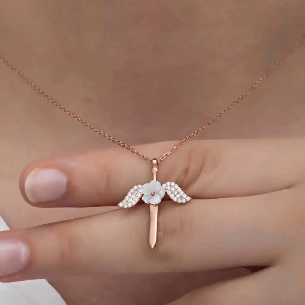 Melekler saflığın ve temizliğin simgeleridir. Bu nedenle melek kolye hediye edilen kişiye melek kadar saf ve temiz olduğu mesajı verilmektedir... Aşkınızı meleklerin koruması için tasarlanan bu özel manolya çiçeği melek kadın kolyeyi sevgilinize; doğum günü, sevgililer günü ve özel günlerde hediye ederek onları mutlu edebilirsiniz. Kolye; 925 ayar gümüşten imal edilmiştir. Gümüş melek kadın kolye üzerine rodyum kaplama yapılmıştır. Rodyum kaplama yapılan tüm kolyeler parlaklığını uzun süre muhafaza eder, gümüşe pembe rengi verir. Tüm gümüş kolyelerde olduğu gibi bu gümüş manolya çiçeği melek kadın kolye de el emeği ile üretilmiştir. Gümüş ve değerli taşlar nedeniyle ürün ağırlığında ± %10 sapma olabilmektedir.