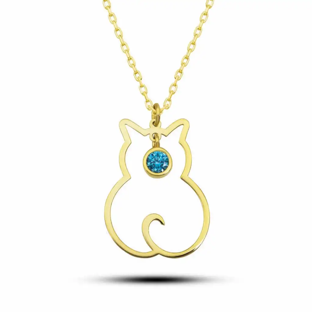 Her bir doğum taşı, belli bir ayla özdeşleşmiştir. Akuamarin mart ayının doğum taşıdır. Latince anlamı deniz suyu olan taş, soluk mavi, yeşil ve koyu mavi renkleri barındırır. Beril ailesine ait bir taş olan akuamarin, lüksü mistizmi ve güzelliği temsil etmektedir. Eski denizciler için güvenli bir yolculuğun sırrı yanlarında akuamarin taşımaktı. Taş sakinlik, sempati, güven, uyum, beraberlik, barış cesaret huzur anlamına gelir. Stresi azaltma, ifade gücünü arttırma, kırışıklıkları önleme gibi bazı etkileri olduğu söylenmektedir. Evlerimizin sevimli neşe kaynağı kediler, temiz olmalarının yanı sıra masumiyetin simgesidir. Asil ve mantıklı bir kişiliğe, mükemmel sezgilere ve akılcı bir duyarlılığa sahiptirler. Özel günlerin en tercih edilen hediye seçeneklerinden olan gümüş takılar, sevdiklerini mutlu etmek ve onlara her an yanlarında taşıyabilecekleri bir hediye vermek isteyenler için tasarlandı. Masumiyetin simgesi olan kedi figürlü gümüş kolye modelini kız kardeşinize, sevgilinize ya da arkadaşlarınıza armağan edebilirsiniz. Akuamarin taşlı kedi kadın kolye modeli 925 ayar gümüşten imal edilmiştir. Gümüş üzerine gold kaplama yapılmıştır. Gold kaplama yapılan gümüş kedi kolye modelleri parlaklığını uzun süre muhafaza eder ve oksitlenmesi gecikir. Kolye üzerinde bulunan tüm taş Akuamarindir. Gümüş olan zincir boyu ortalama 45 cm'dir. Gümüş kadın kedi kolye diğer tüm gümüş kadın kolye modellerinde olduğu gibi el emeği ile üretilmiştir. Gümüş ve değerli taşlar nedeniyle belirtilen ortalama ürün ağırlığında ± %10 sapma olabilmektedir.